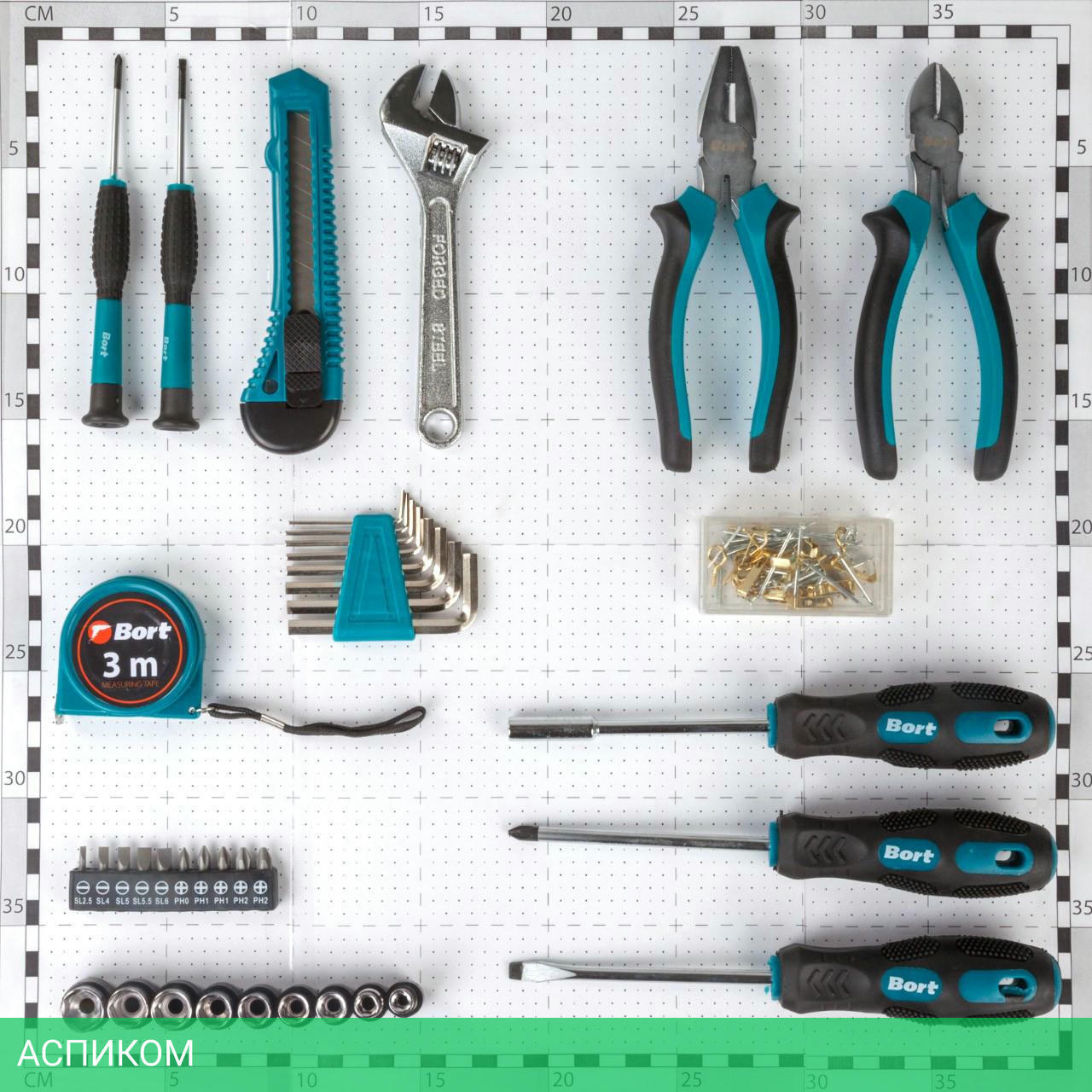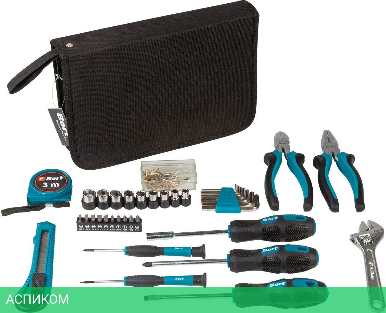 Плоскогубцы (1 шт) Бокорезы (1 шт) Ключ шестигранный (8 шт) Торцевая головка квадрат (9 шт) Рулетка измерительная 3м (1 шт) Ключ разводной (1 шт) Часовая отвертка (2 шт) Крепежные изделия (1 шт) Бита 25 мм (8 шт) Нож (1 шт) Отвертка (2 шт) Отвертка для бит (1 шт)