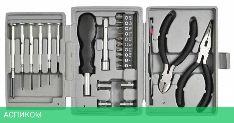 отвертки - 6 шт; биты - 10 шт; шарнирно-губцевый инструмент - 2 шт; торцевые головки 4 шт; пинцет - 1 шт