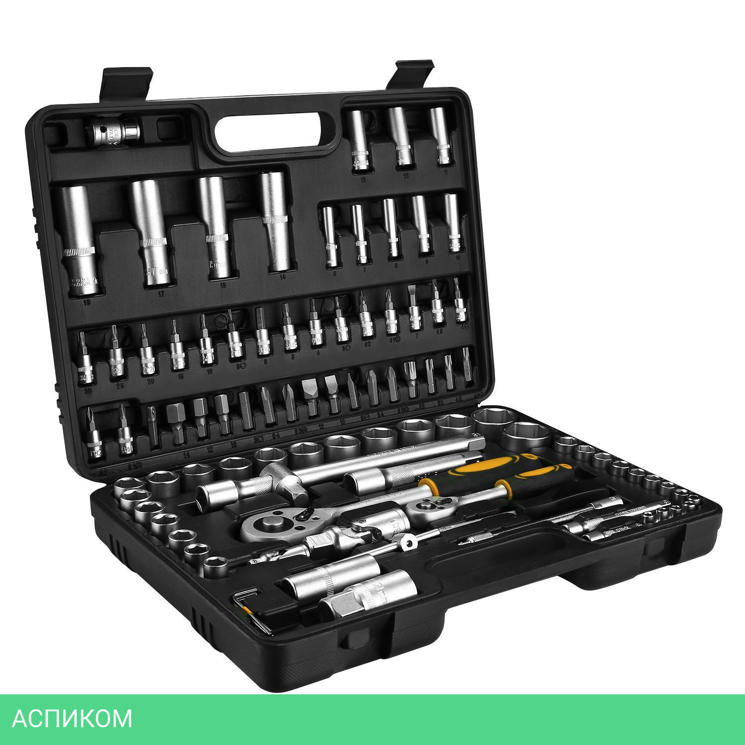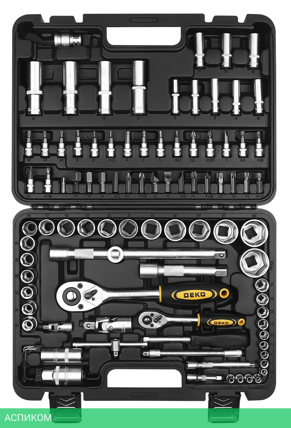 - Головки 1/4": 4, 4.5, 5, 5.5, 6, 7, 8, 9, 10, 11, 12, 13, 14 мм.- Головки удлиненные 1/4": 6, 7, 8, 9, 10, 11, 12, 13 мм.- Удлинитель торцевых головок 1/4" х 2", 4".- Шарнир карданный 1/2", 1/4".- Держатель для бит 1/4".- Удлинитель гибкий 1/4" х 6".- Трещотка 1/2", 1/4".- Биты: SL4, 5.5, 7; PH1, 2; PZ1, 2; HEX3, 4, 5, 6; T8, 10, 15, 20, 25, 30.- Головка свечная 1/2": 16 мм, 21 мм.- Переходник для головок торцевых 1/2".- Головки 1/2": 10, 11, 12, 13, 14, 15, 16, 17, 18, 19, 20, 21, 22, 23, 24, 27, 30, 32 мм.- Головки удлиненные 1/2": 14, 15, 17, 19 мм.- Удлинитель торцевых головок 1/2": 5", 10".- Выдвижной Т-образный стержень 1/4".- Шестигранный ключ 1.5, 2, 2.5 мм.- Переходник для бит 1/2"Х8мм.- Биты: SL8, 10, 12; T40, 45, 50, 55; PH3, 4; PZ3, 4; HEX8, 10, 12, 14.