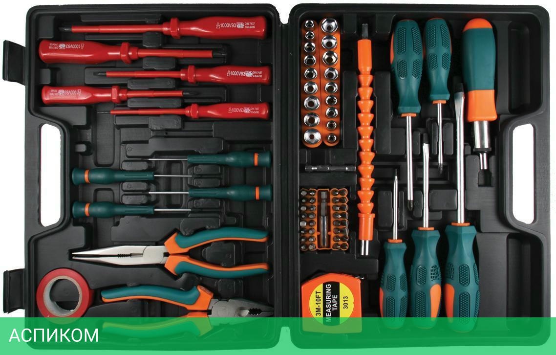 отвертка - 14 шт; длинногубцы - 1 шт; комбинированные плоскогубцы - 1 шт; изоляционная лента - 1 шт; тестер - 1 шт; рулетка - 1 шт; отвертка-битодержатель - 1 шт; удлинитель гибкий - 1 шт; адаптер - 1 шт; бита - 32 шт; головка торцевая - 18 шт