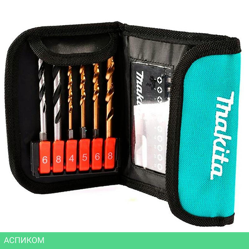 набор включает в себя набор насадок 10 шт. Makita D-30651 с магнитный держателем и биты: PZ1, PZ2, PZ3, PH1, PH2, PH3, T15, T20, T25, T30. А так же 6 шт. сверл с хвостовиком 1/4 дюйма: по дереву 6, 8 мм; по металлу 4, 5, 6, 8 мм.