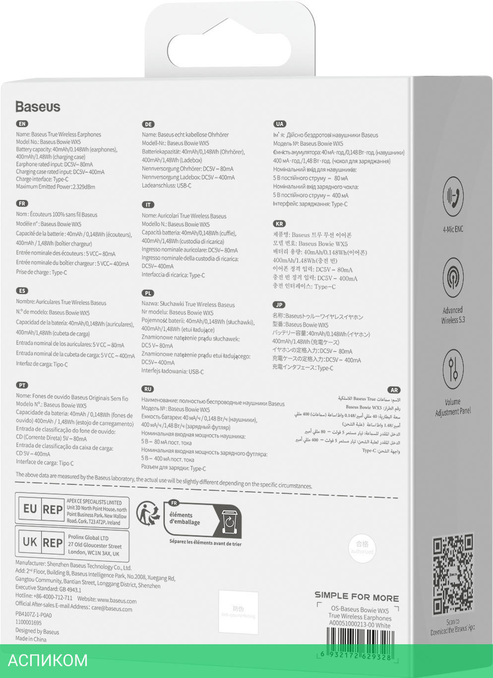 наушники с микрофоном / белый / вставные / да / внутри уха / полуоткрытое / полностью беспроводные (TWS) / Bluetooth / 20.0 / 20000.0 / пластик / нет / 6.5 / 30.0