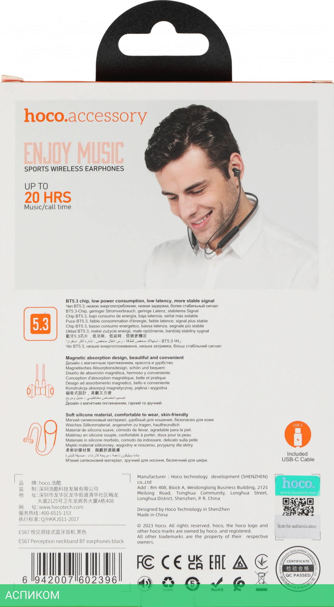 наушники с микрофоном / вставные / да / внутри уха; на шее / черный / закрытые / соединенные кабелем/оголовьем / Bluetooth / 20.0 / 20000.0 / пластик / пластик / да / 20.0