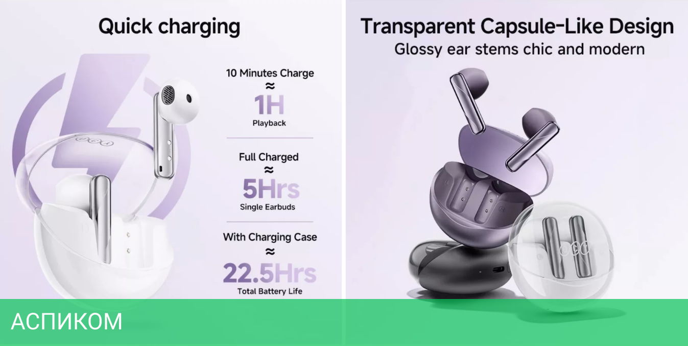 наушники / вставные / да / внутри уха / фиолетовый / полуоткрытое / полностью беспроводные (TWS) / Bluetooth / 20.0 / 20000.0 / пластик / силикон / нет / 5.0 / 22.5