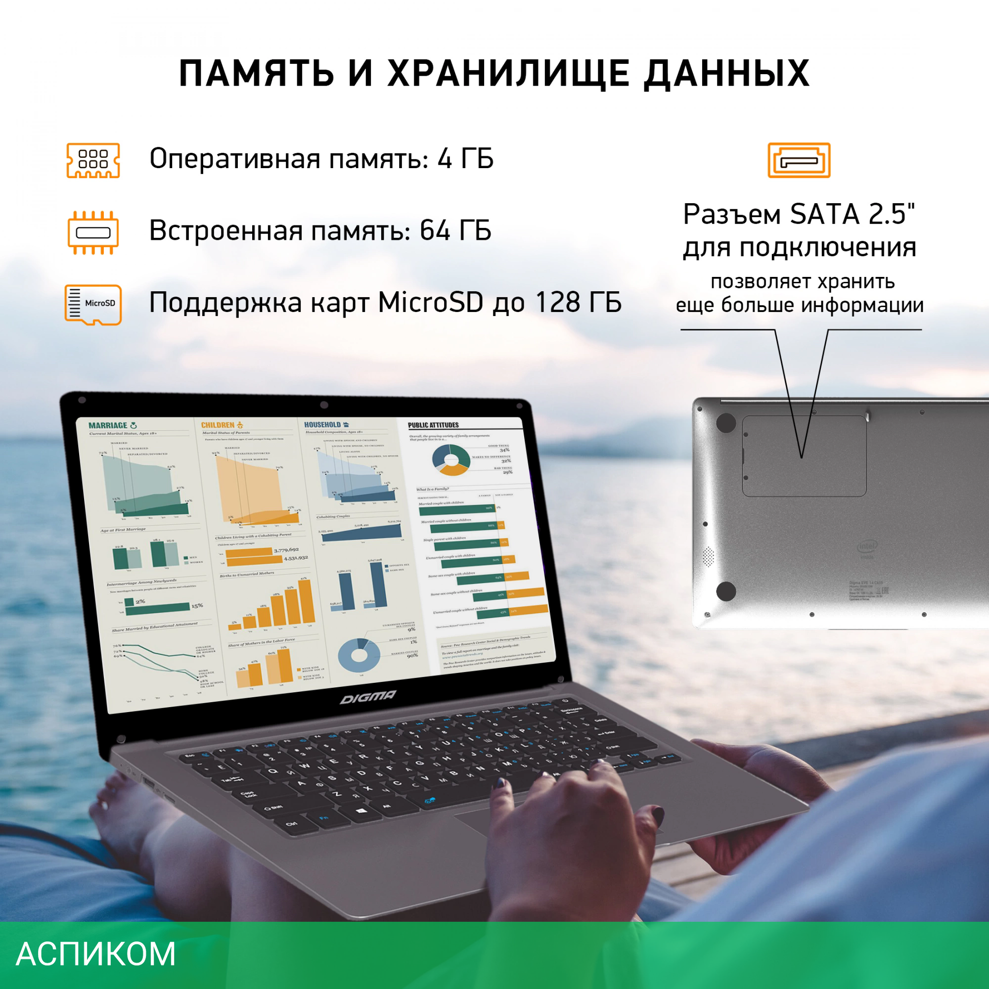 Разъем SATA 2.5" для подключения внешнего диска (под крышкой, максимальный размер 100 х 70 х 7 мм)