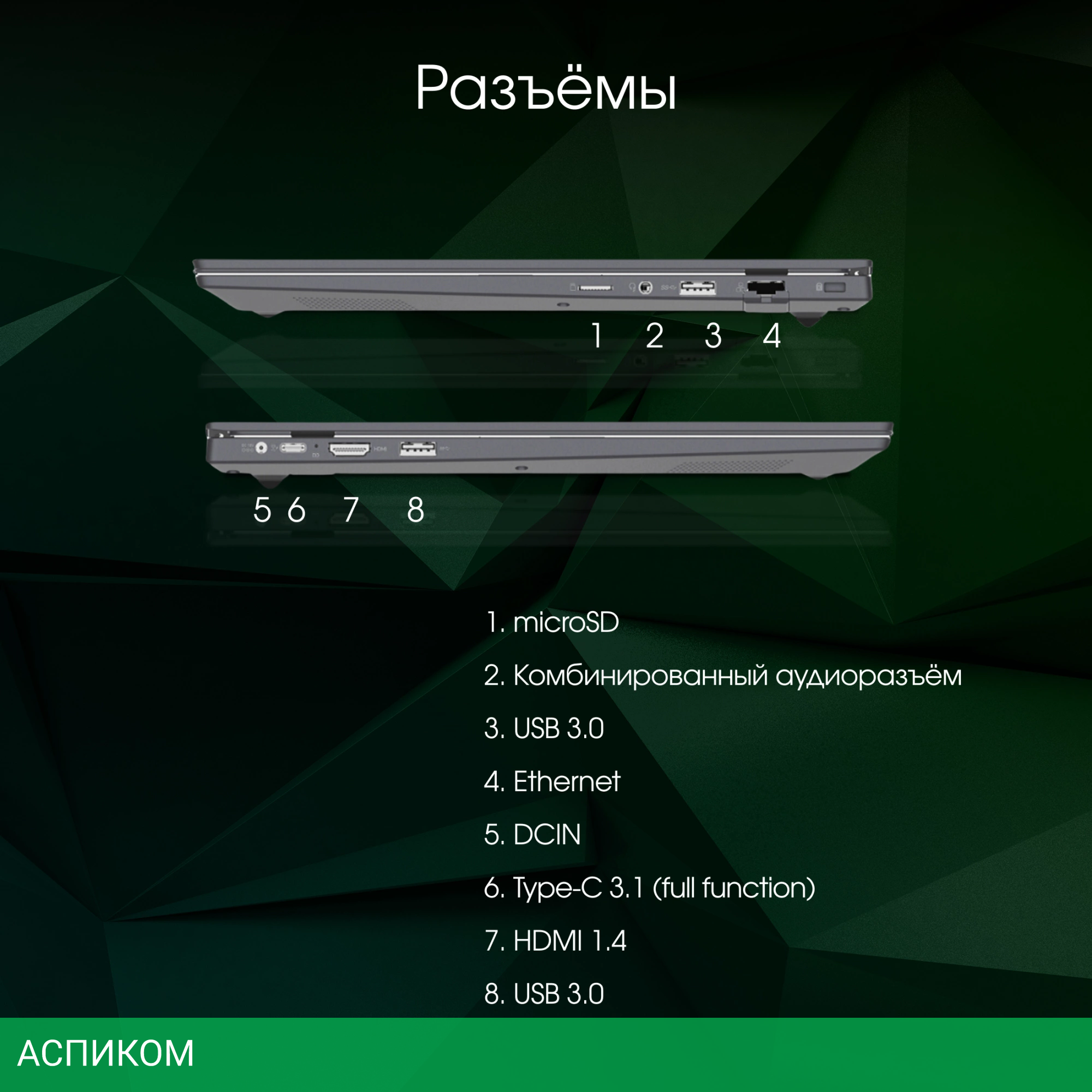 Множество портов: Вам доступны USB 3.0, USB Type-C, HDMI 1.4 для подключения внешних устройств и монитора, а также гигабитный Ethernet-разъем для стабильного интернета. Все порты поддерживают передачу видео через USB Type-C, что расширяет возможности устройства.