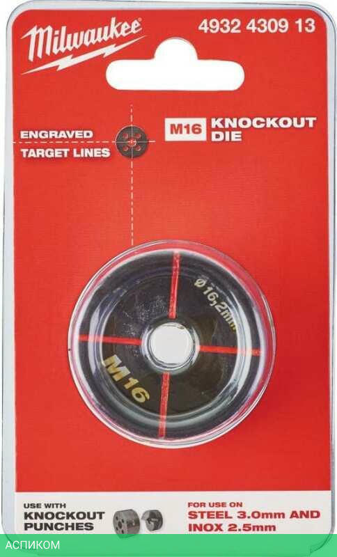 работает в комплекте с пробойником Milwaukee M16 арт. 4932430841 и направляющими шпильками арт. 49162680, 49162681