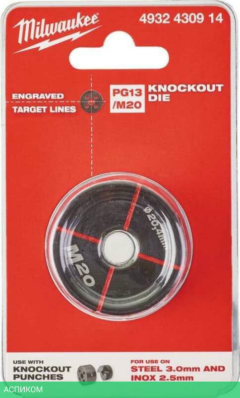работает в комплекте с пробойником Milwaukee PG13/M20 арт. 4932430842 и направляющими шпильками арт. 49162680, 49162681