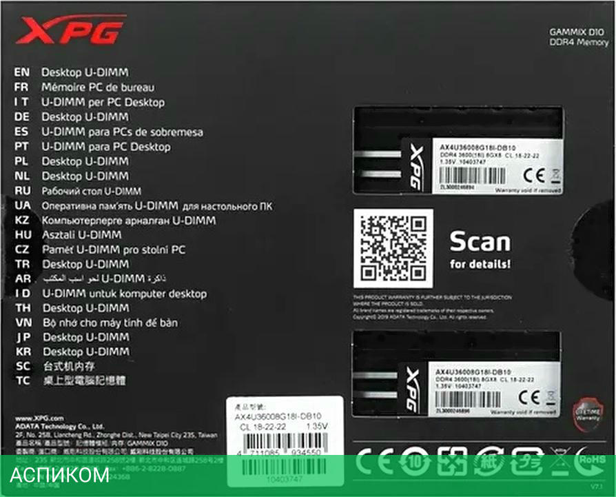 Оперативная память A-Data AX4U36008G18I-DB10/DDR4 DIMM/3600 МГц/CL18-20-20