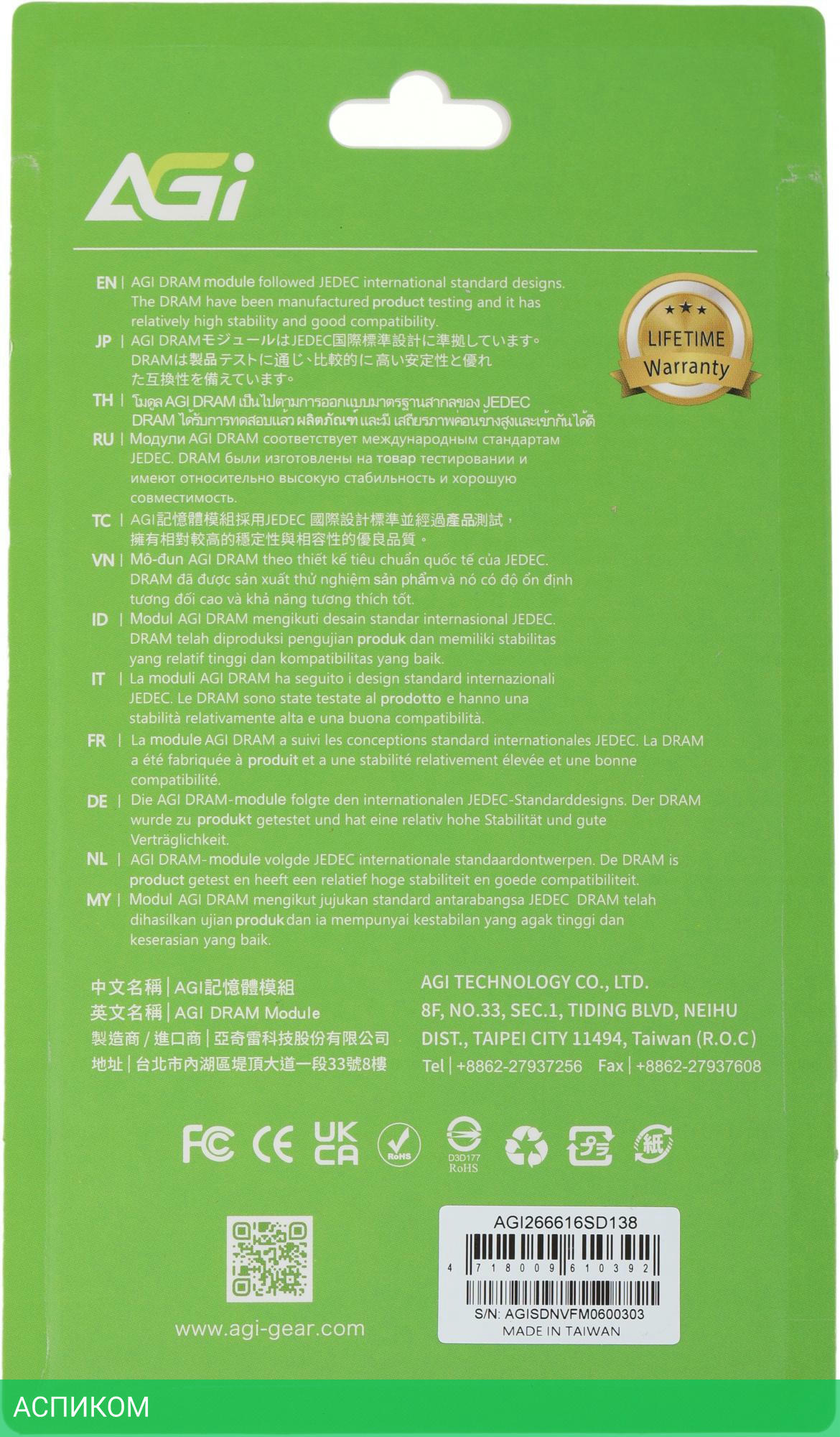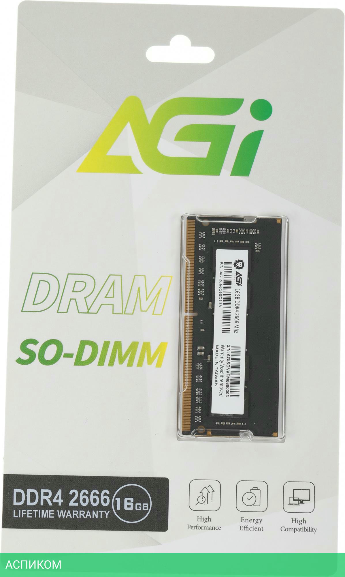 Оперативная память AGI 16GB AGI266616SD138/DDR4 SODIMM/2666 МГц/CL19-19-19-43/RTL