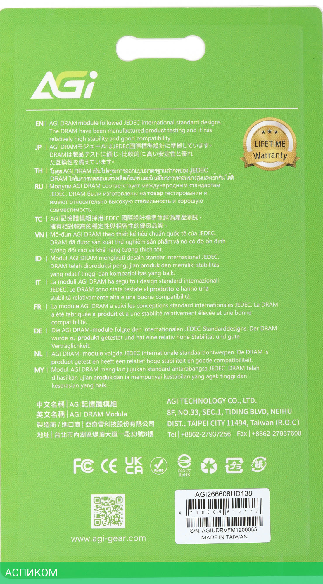 Оперативная память AGI 8GB DDR4 DIMM PC4-21300 Bulk (AGI266608UD138)/DDR4 DIMM/2666 МГц/OEM