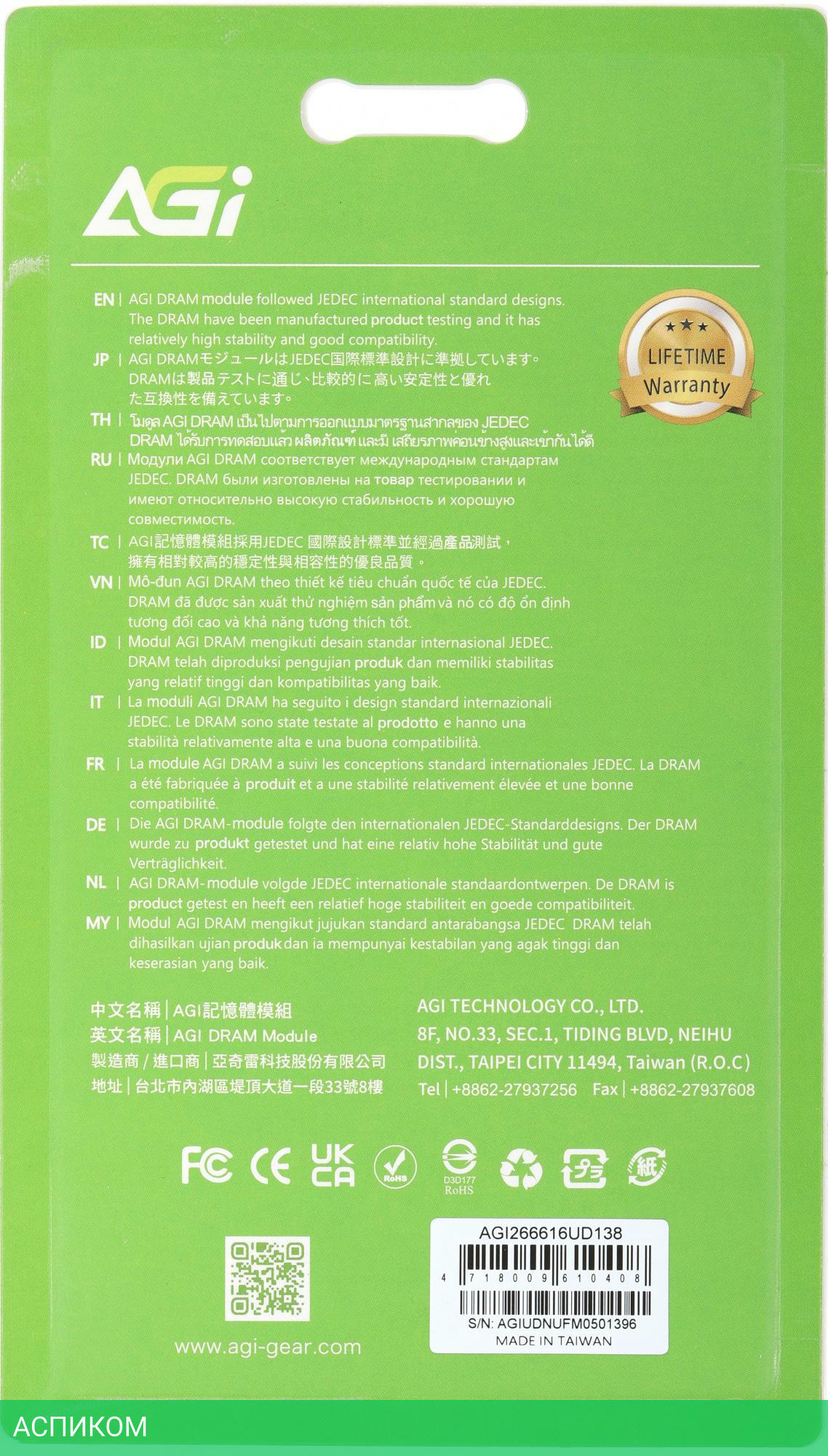 Оперативная память AGI DDR4 16Gb 2666MHz (AGI266616UD138)/DDR4 DIMM/2666 МГц/OEM