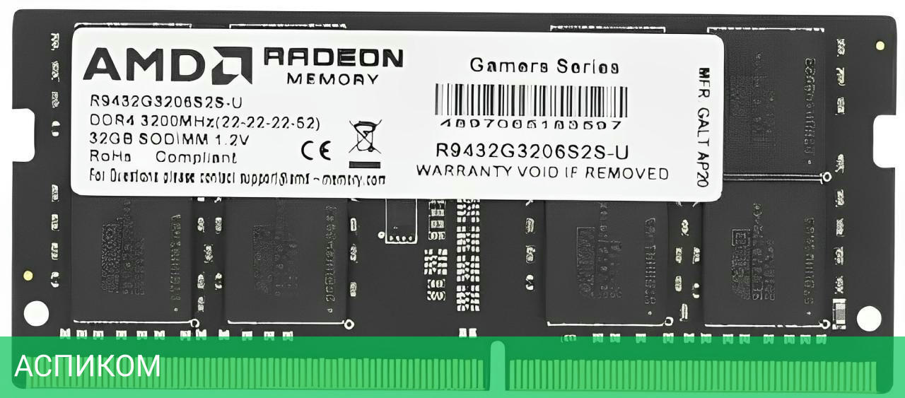 Оперативная память AMD Radeon R9 Gamer Series 32GB DDR4 (R9432G3206S2S-U)/DDR4 SODIMM/3200 МГц/CL22-22-22-52/OEM