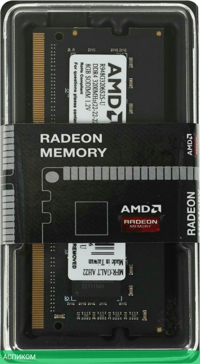 Оперативная память AMD Radeon R9 Gamer Series 8GB DDR4 SODIMM PC4-25600 (R948G3206S2SU)/DDR4 SODIMM/3200 МГц/CL22-22-22-52