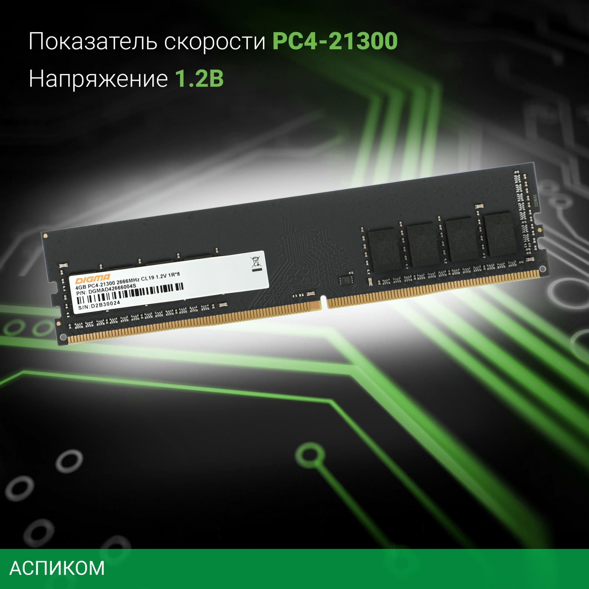 Оперативная память Digma DDR4 4Gb 2666MHz (DGMAD42666004S)/DDR4 DIMM/2666 МГц/CL19-19-19-43/RTL