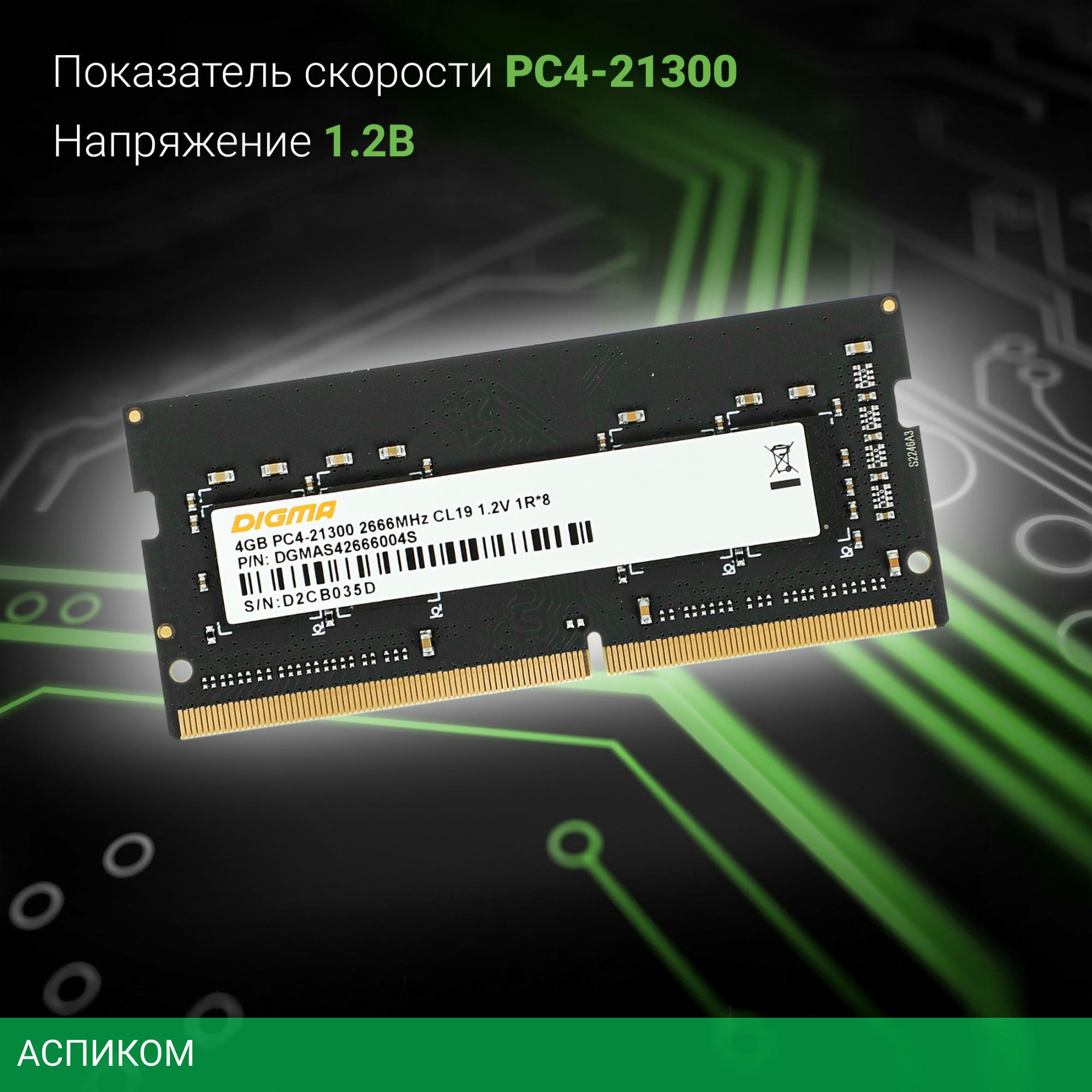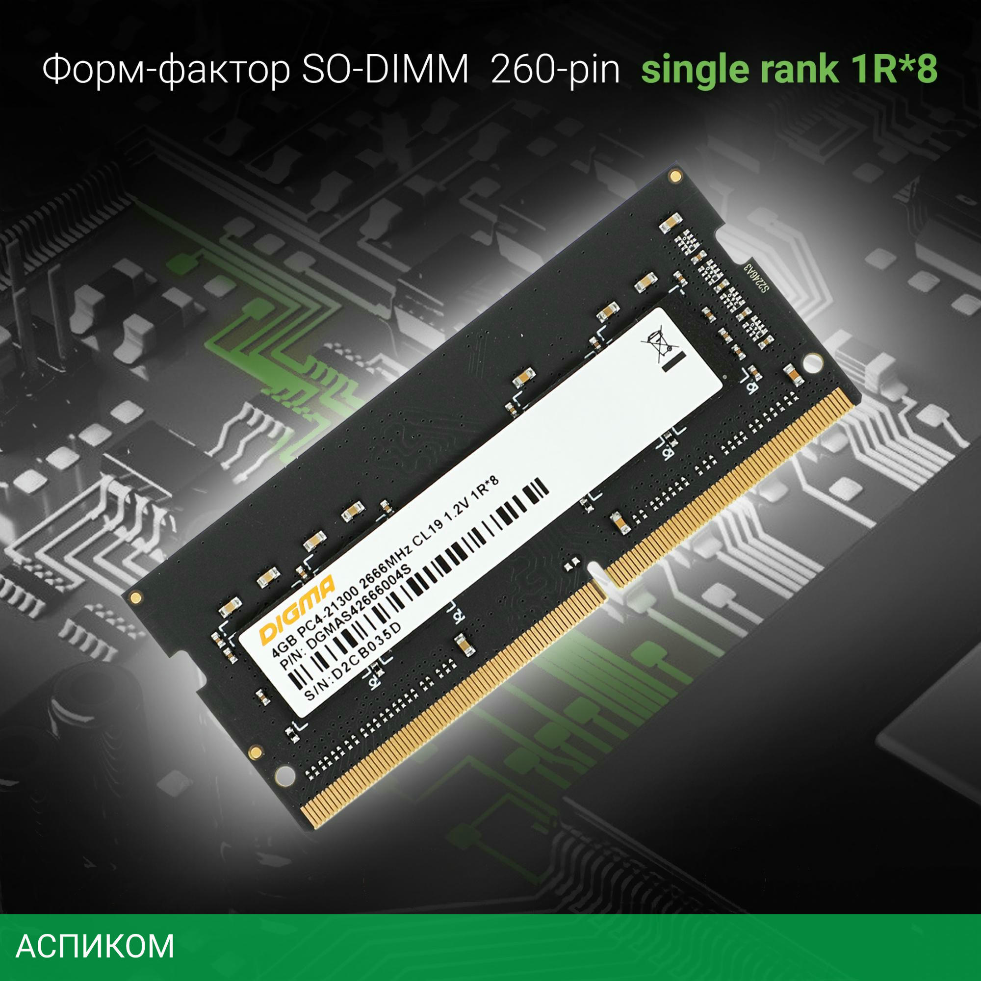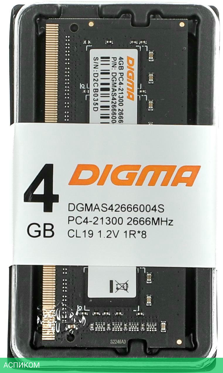 Оперативная память Digma DDR4 4Gb 2666MHz (DGMAS42666004S)/DDR4 SODIMM/2666 МГц/CL19-19-19-43/RTL