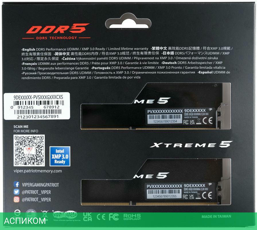 Оперативная память Patriot Viper Xtreme 5 2x16GB DDR5 (PVX532G76C36K)/DDR5 DIMM/7600 МГц/CL36-48-48-84