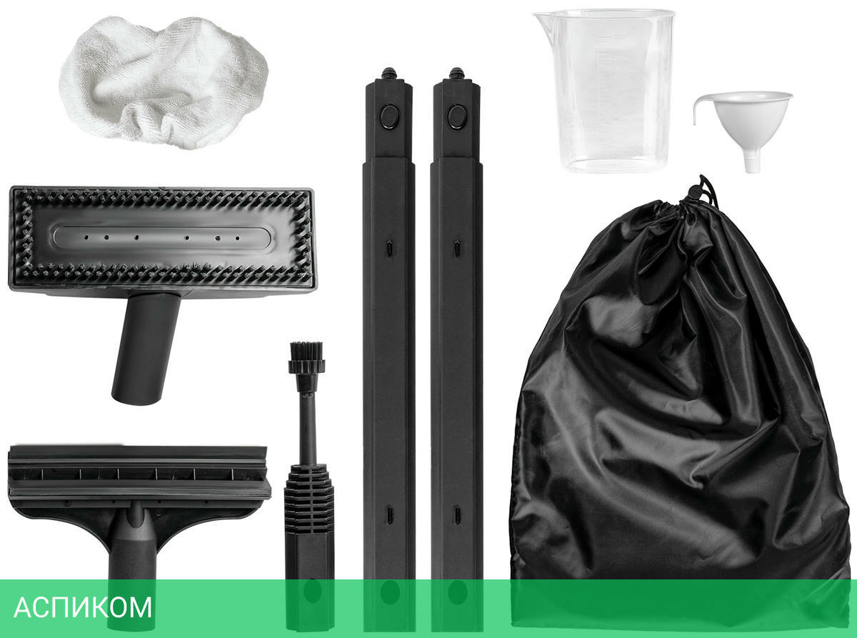 - щелевая насадка;- круглая щетка;- воронка;- мешок для хранения аксессуаров;- мерный стакан;- уплотнительное кольцо.