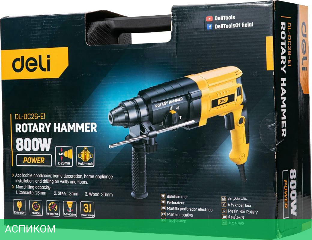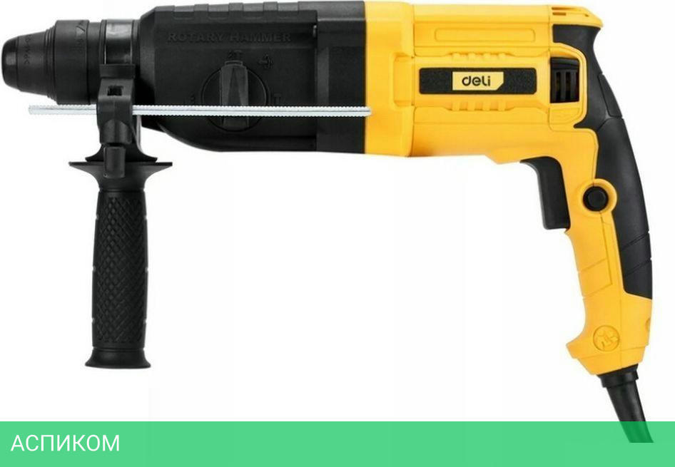 перфоратор, ограничитель глубины сверления, буры 6, 8, 10 мм, пика, долото, съемная рукоятка, инструкция, кейс