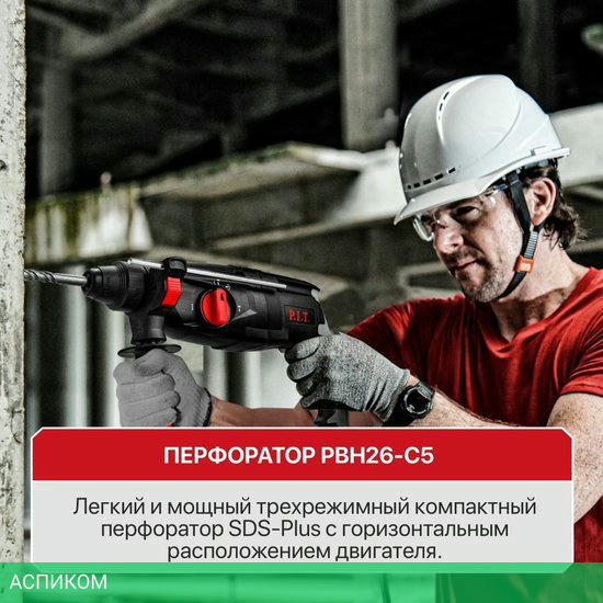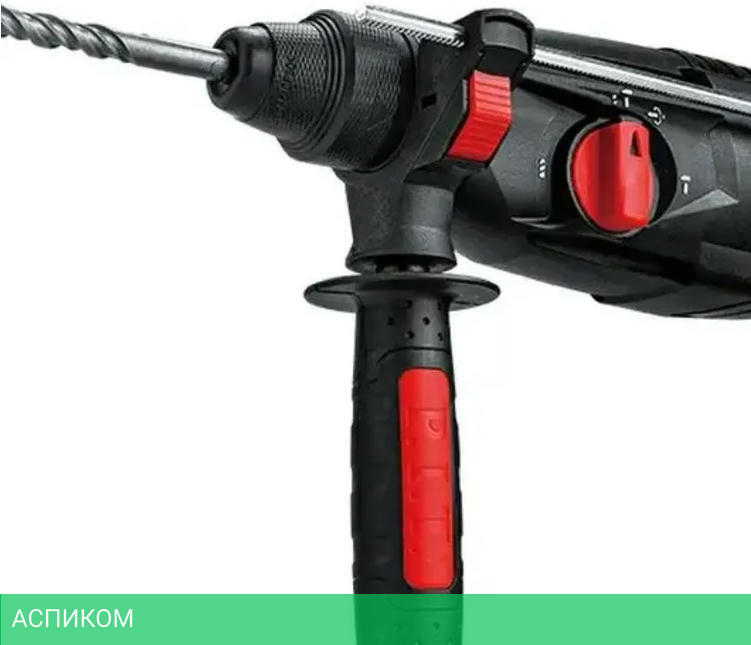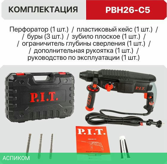 инструмент, дополнительная рукоятка, ограничитель глубины сверления, буры с хвостовиком SDS-plus, плоское зубило, пикообразное зубило, руководство по эксплуатации, инструкция по безопасности и пластиковый кейс.