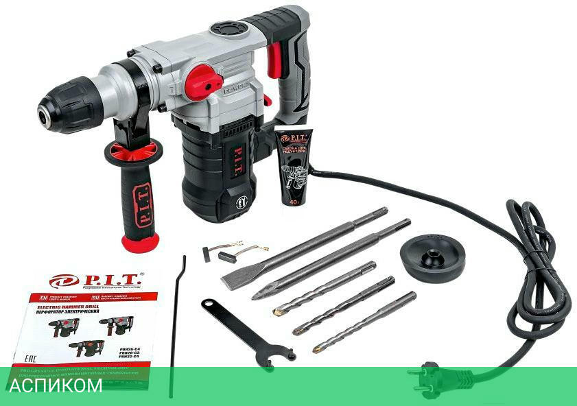 - перфоратор- пластиковый кейс- дополнительная рукоятка- ключ- щетки угольные- буры (3 шт)- зубило плоское- зубило пикообразное- смазка для редуктора- пыльник- ограничитель глубины сверления- инструкция по эксплуатации