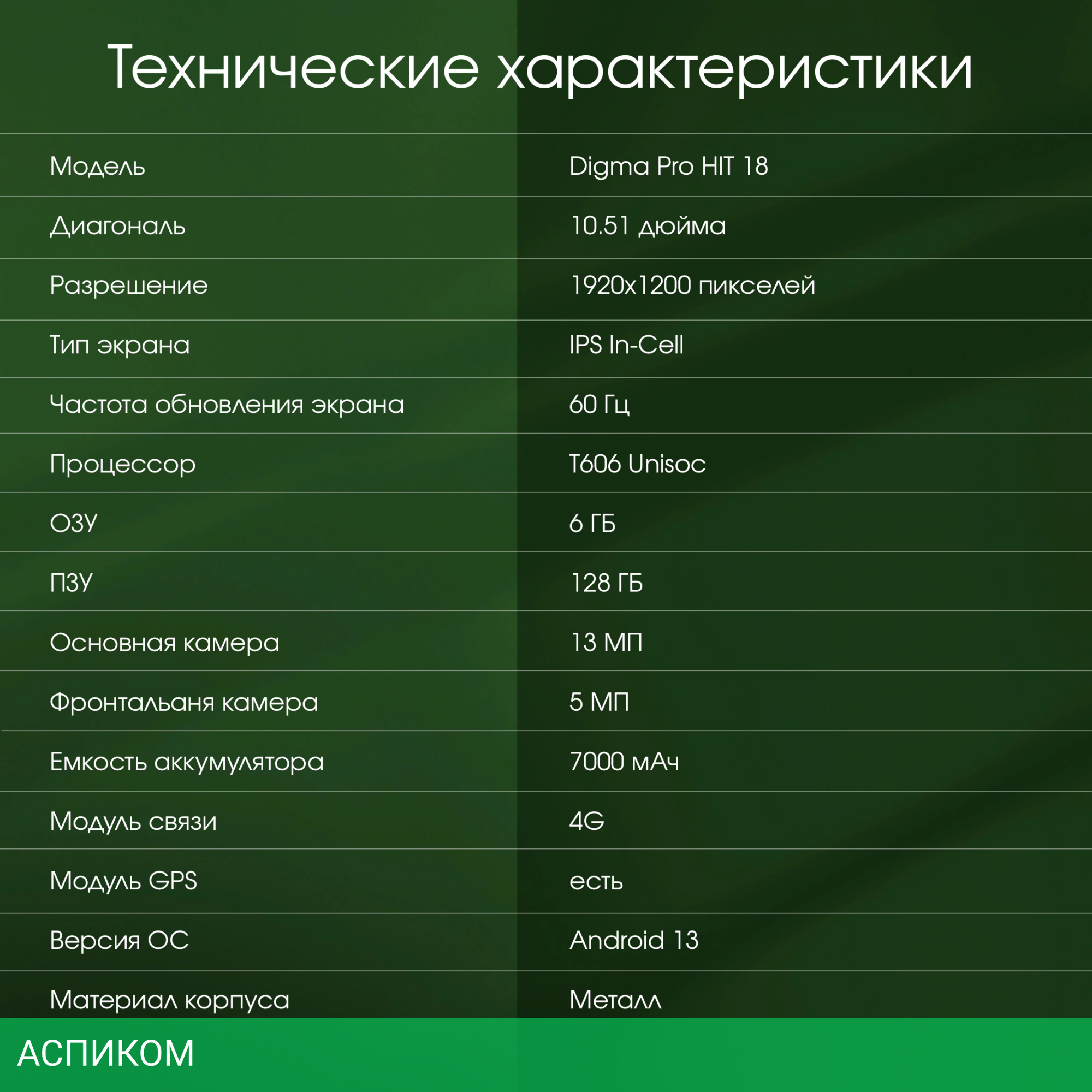 Планшет Digma Pro HIT 18 T606 6/128Gb фиолетовый (HS1010PL)/Android 13/10.51″/1920x1200/1.6GHz/6GB/128GB/microSD/7000 mAh/фиолетовый