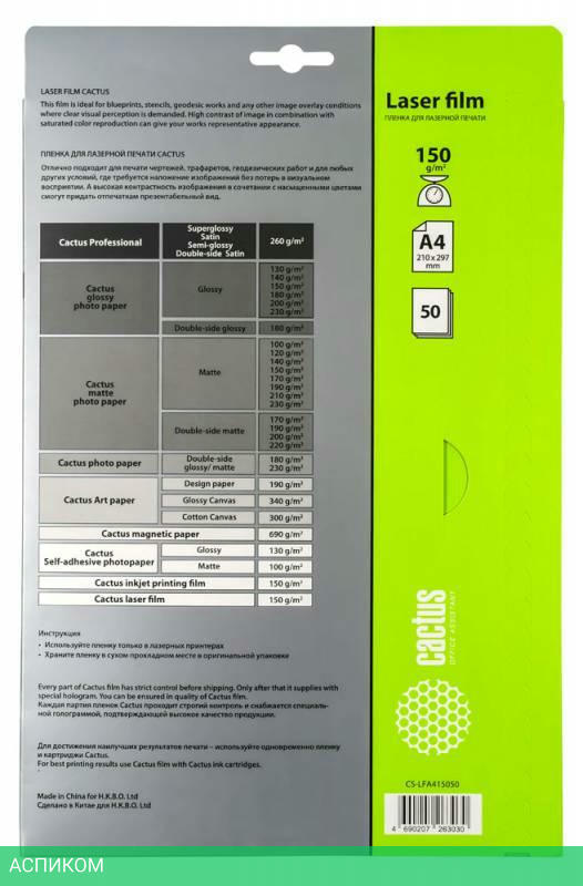 пленка для печати / листы / лазерная печать / прозрачная / A4 / 50