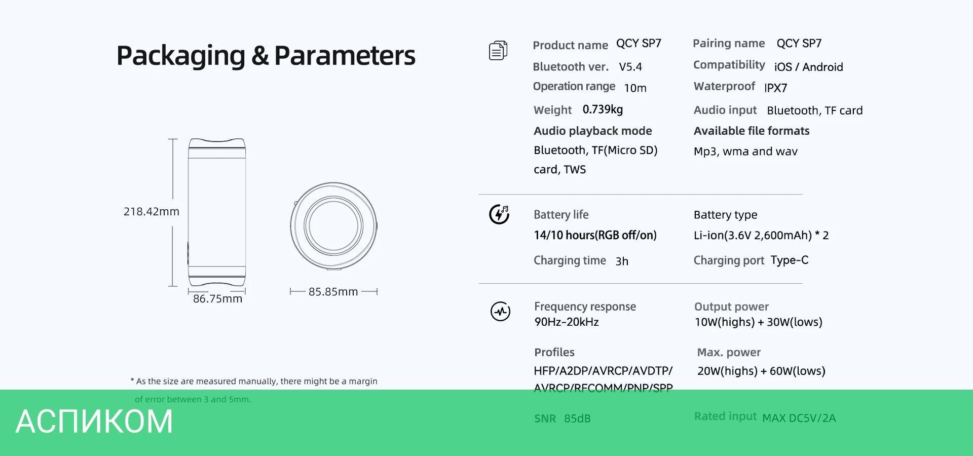 Bluetooth колонка / зеленый / от аккумулятора / 40.0 / 5.4 / microSD / IPX7 / пластик