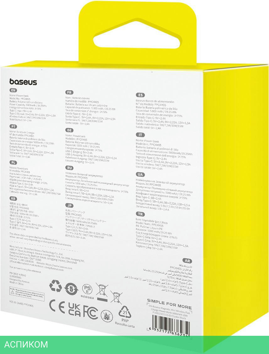 Портативное зарядное устройство Baseus PPCXM05 Stellar White (P10022107223-00)/5000mAh/20W/PD/QC 2.0/QC 3.0/2.4A/USB Type-C/пластик/белый