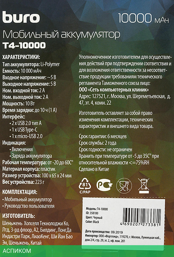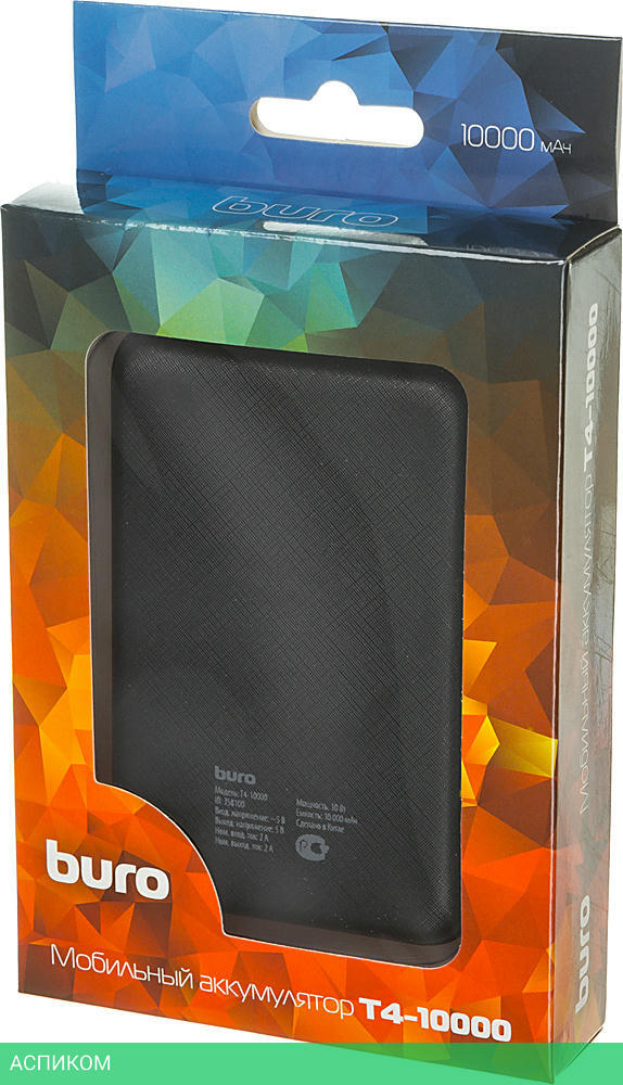 Портативное зарядное устройство Buro T4-10000/10000mAh/10W/2.1A/USB Type-A/пластик/черный