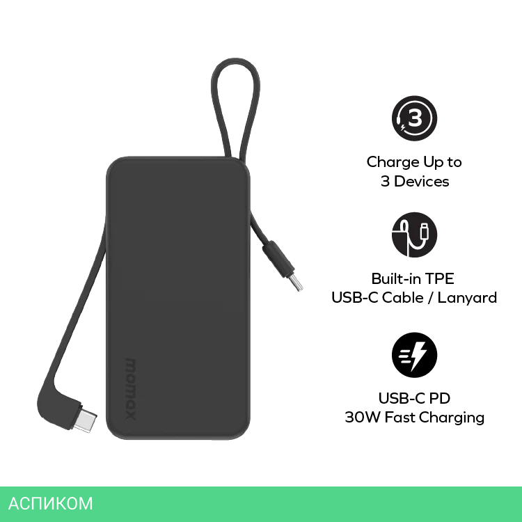 Портативное зарядное устройство Momax IP138 1-Power Vital+ Black (IP138D)/10000mAh/30W/PD/3A/USB Type-C/пластик/черный