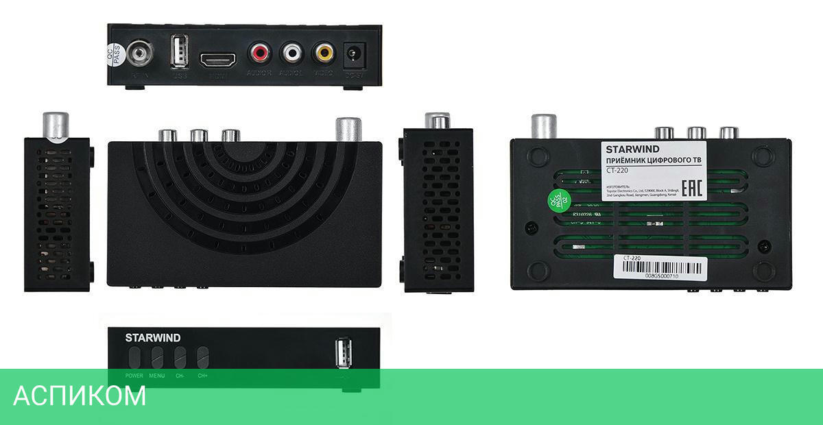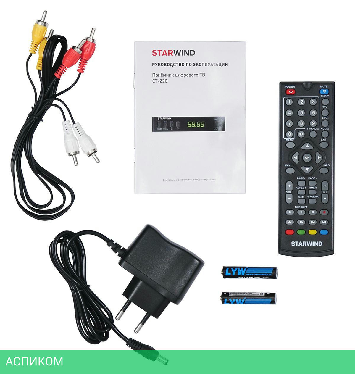 кнопки управления на корпусе, дисплей (каналы или часы). При подключении к интернету (USB WiFi адаптер на чипсете MTK MT7601 приобретается отдельно) доступны YouTube, Погода, RSS новости, IPTV, MEGOGO. В комплекте: ТВ-ресивер, пульт ДУ и батарейки к нему, видеокабель RCA, блок питания, инструкция