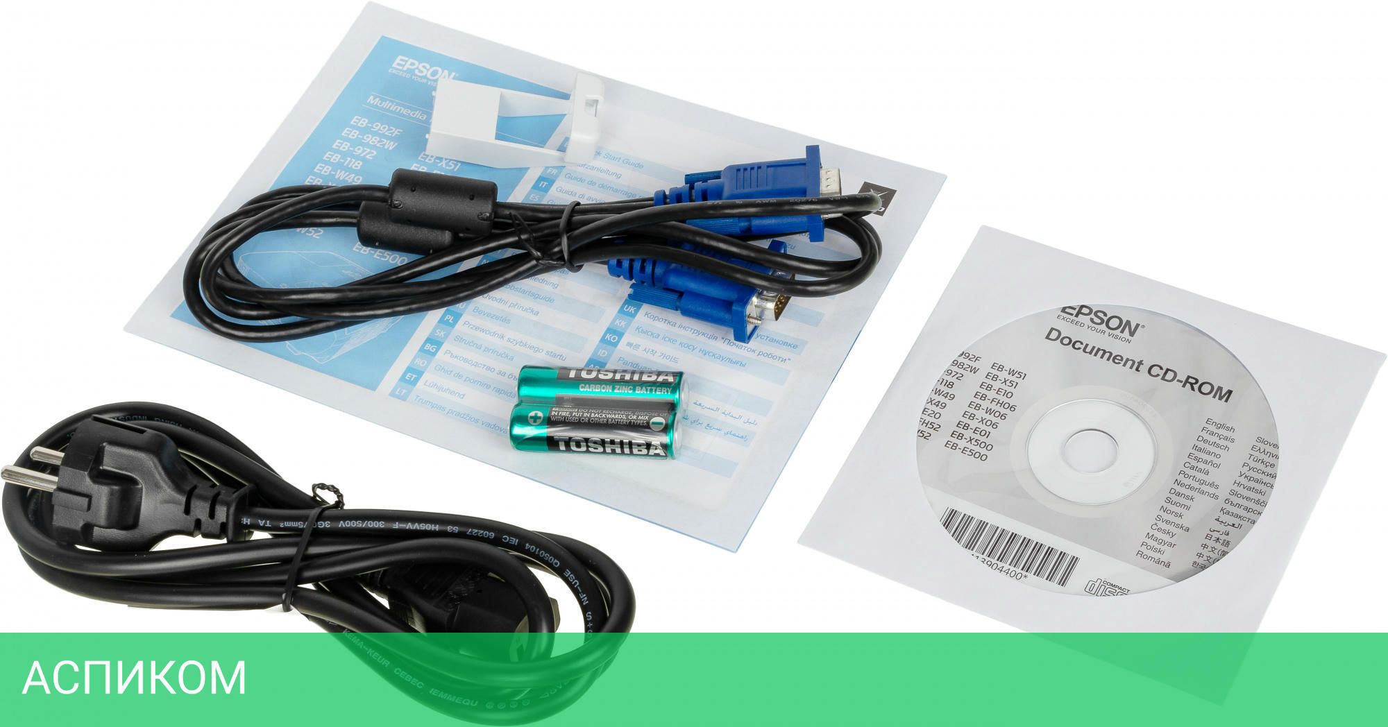 Проектор,Кабель питания 1,8 м,Кабель для подключения к ПК с 15-контактным разъемом D-Sub n/n 1,8м,Пульт ДУ,Руководство пользователя
