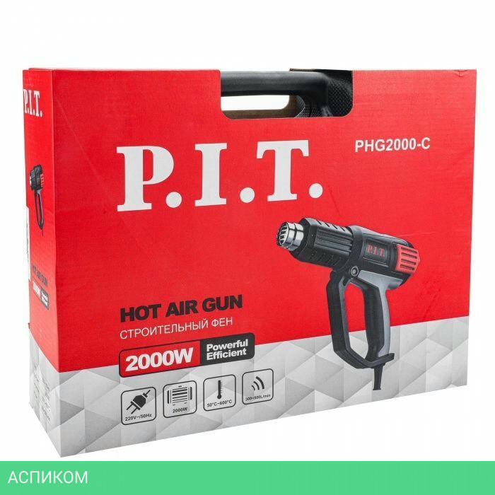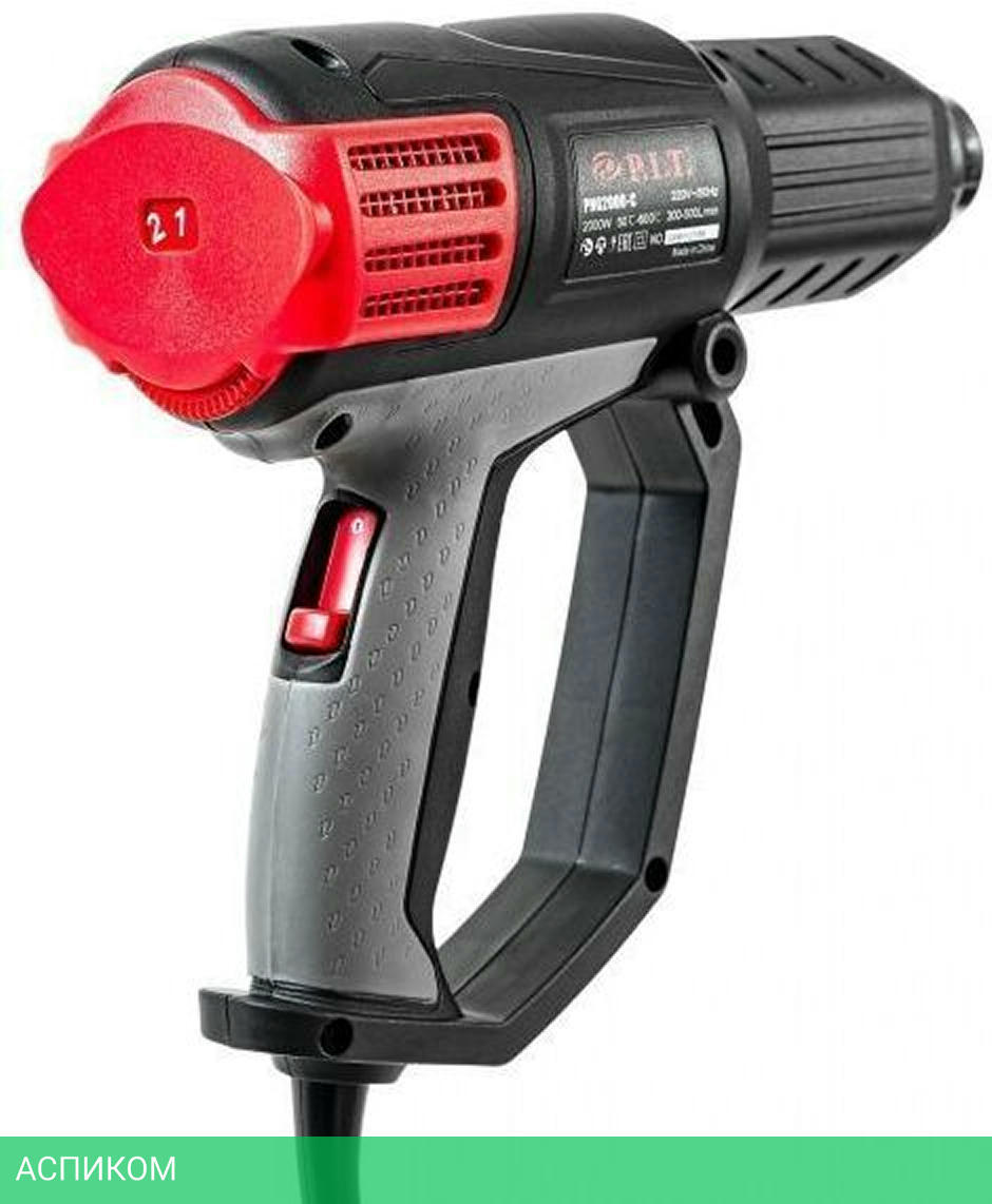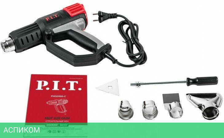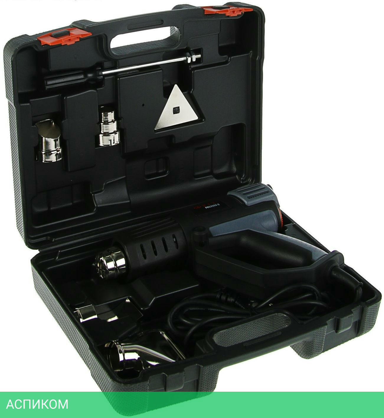 термофен, отражающее сопло, широкая насадка, редукторное сопло, рефлекторное сопло, скребок для краски и пластиковый кейс.