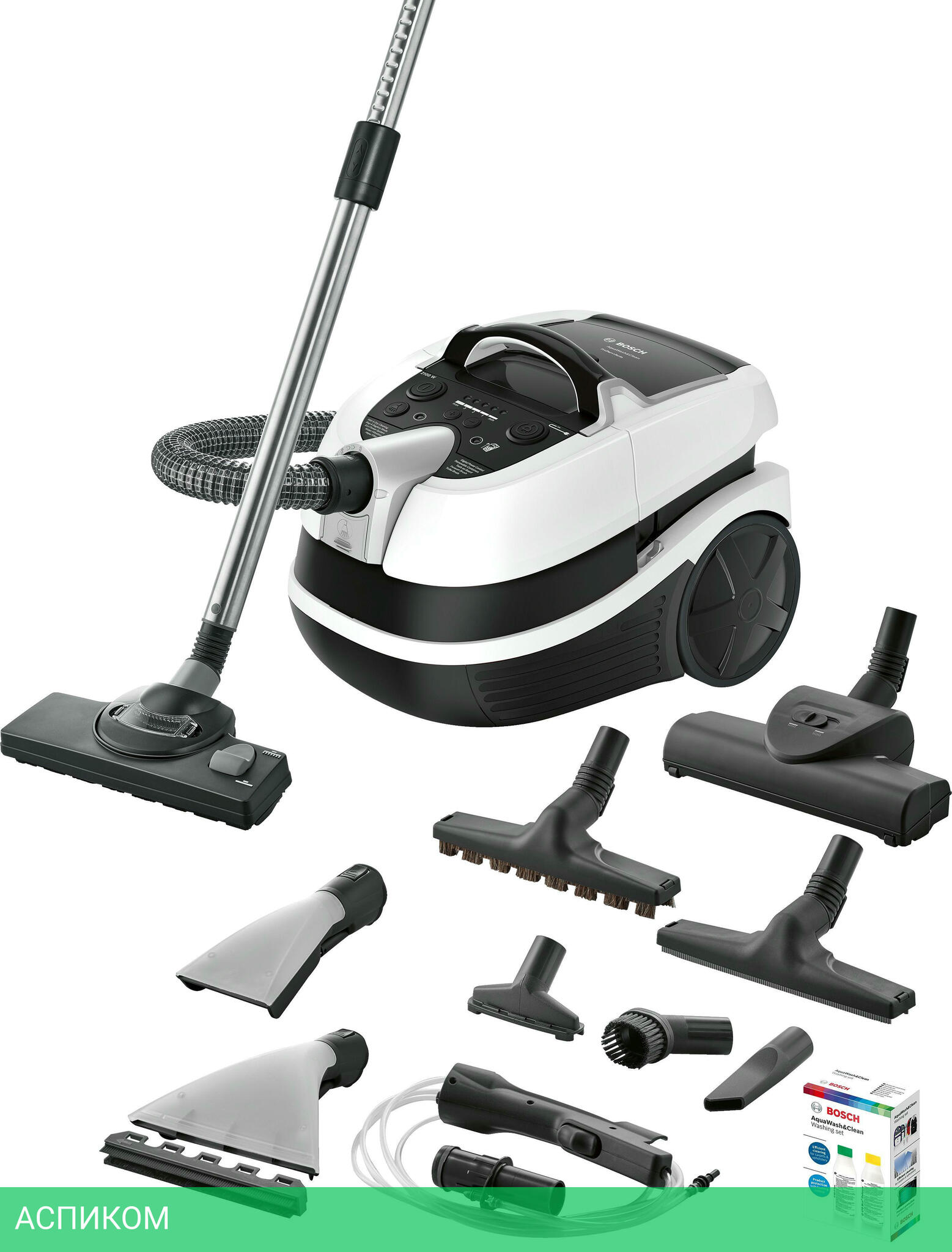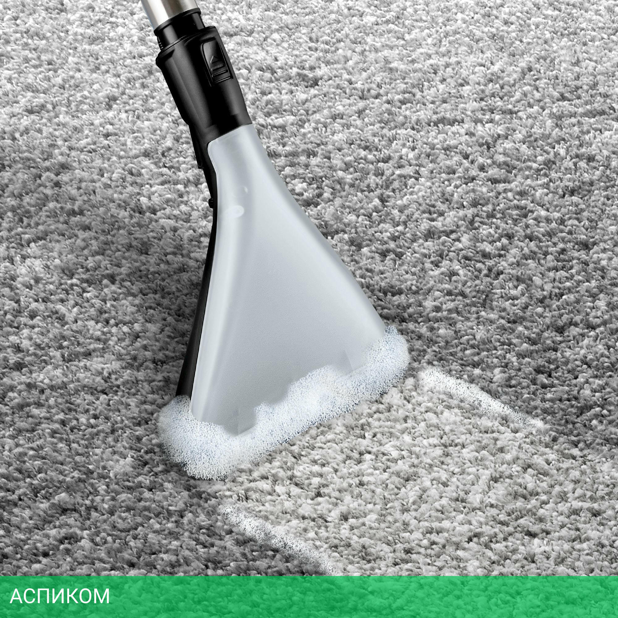 моющий пылесос; телескопическая штанга; гибкий FLEXI-шланг; трубка для подачи воды; универсальная щетка; насадки для мебели, щелей и паркетной доски; турбощетка; распылительные насадки (большая и малая); всасывающая насадка для сбора воды; моющее средство; нейтрализатор пены