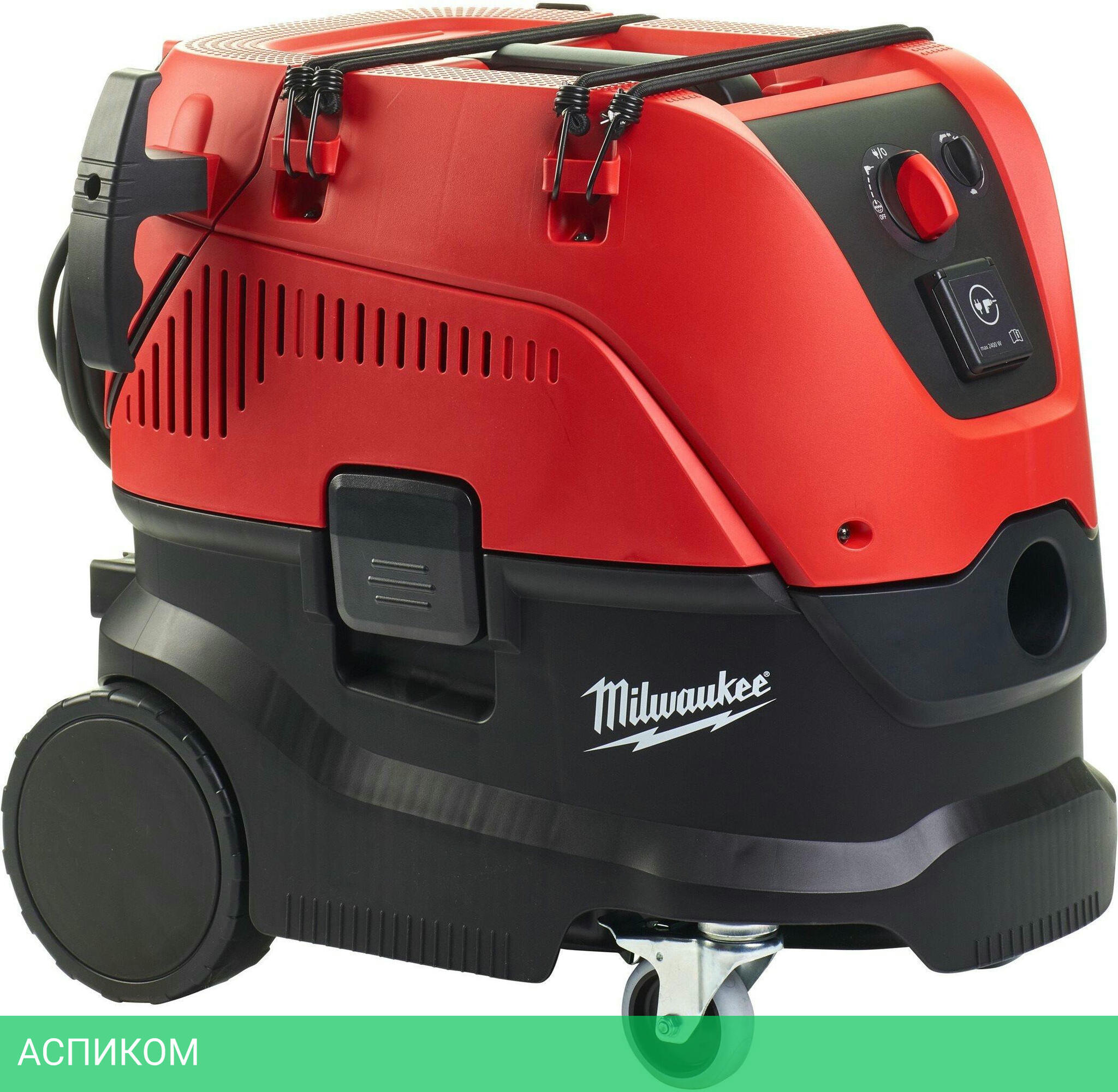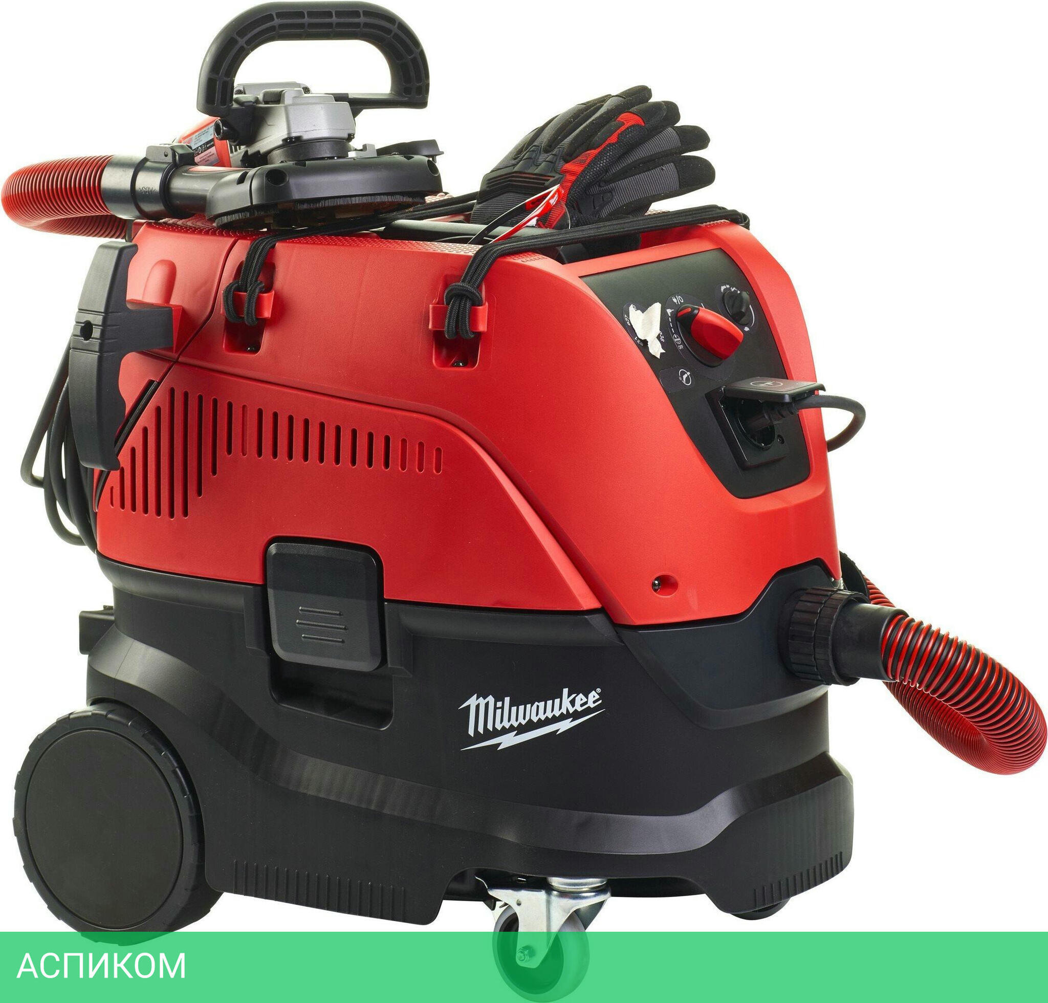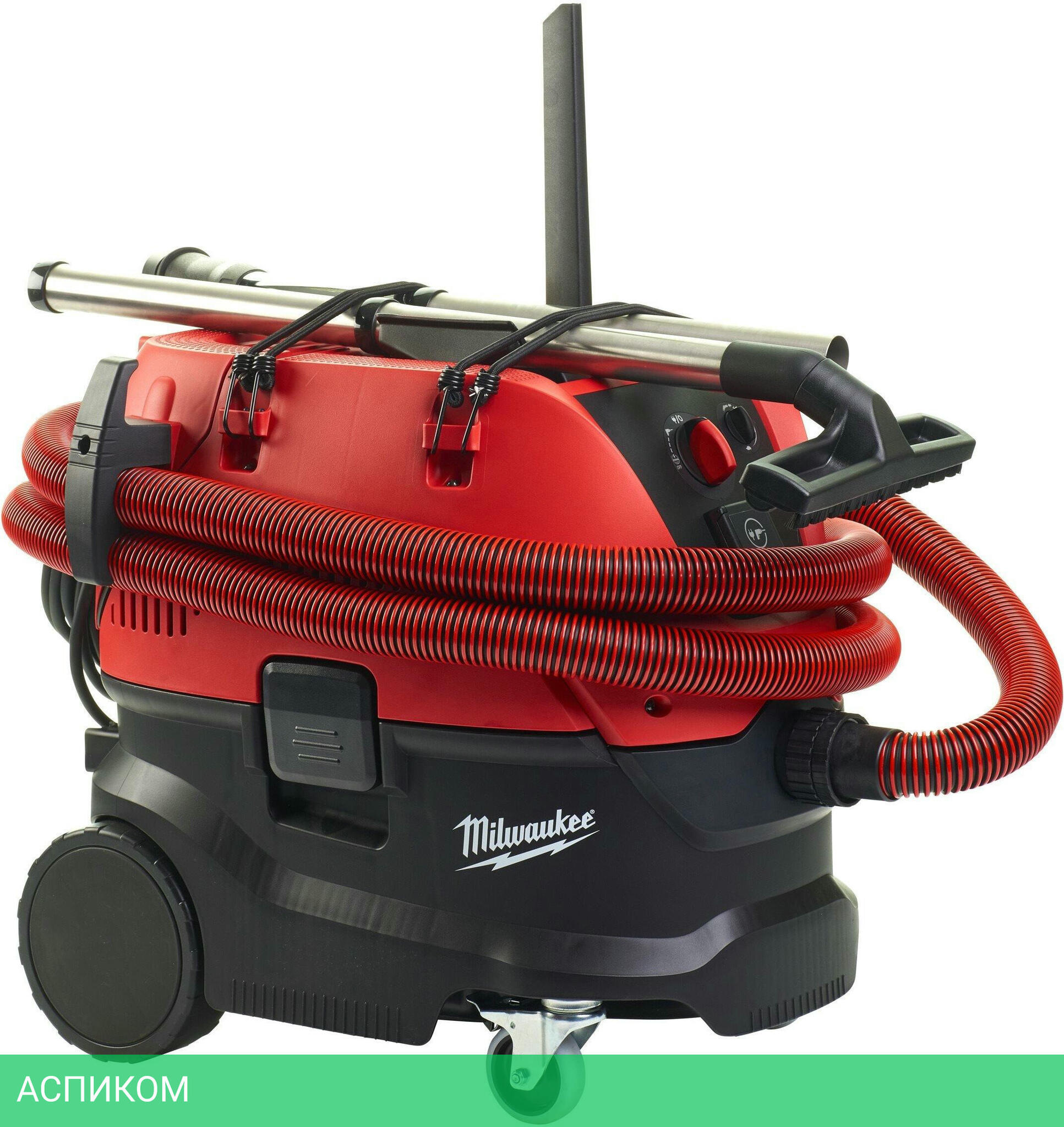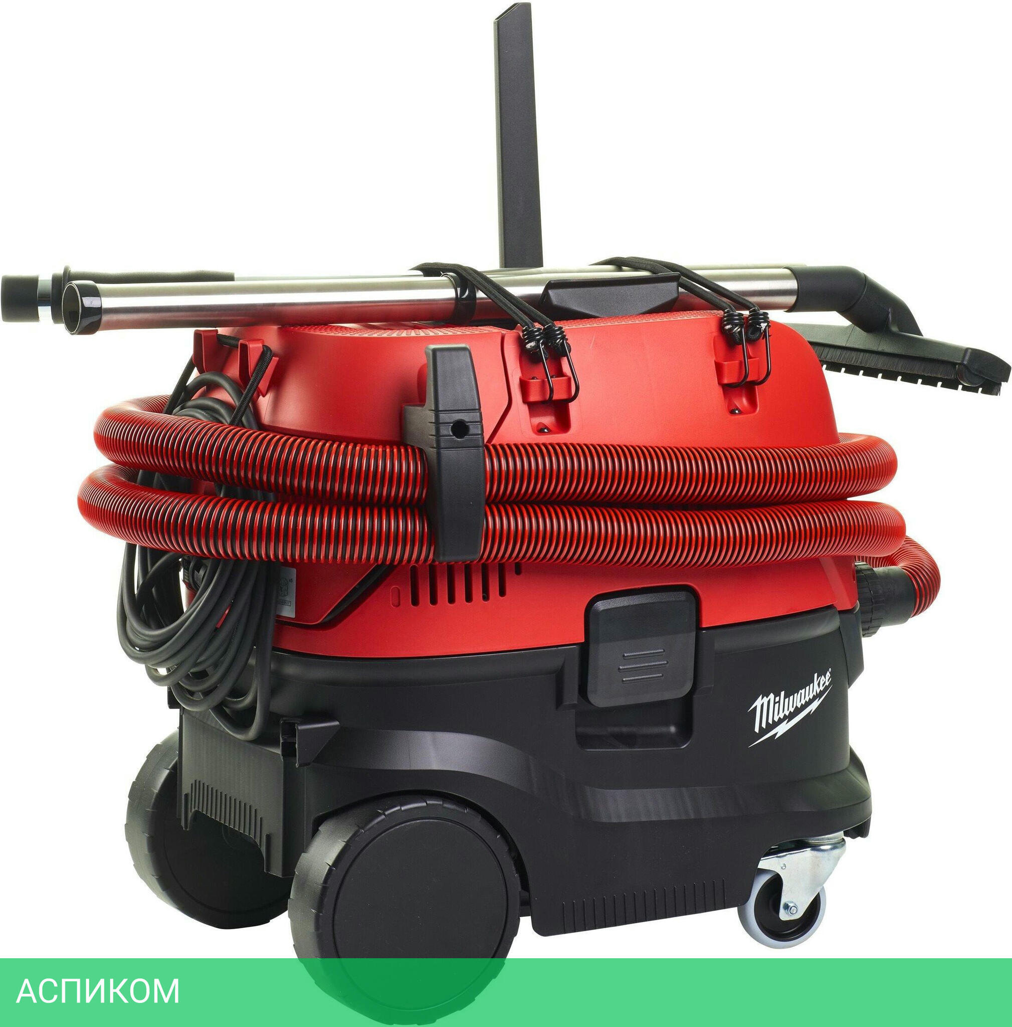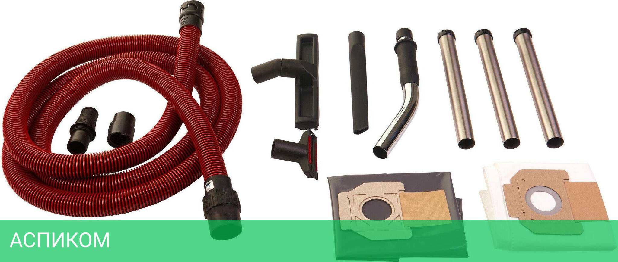 пылесос, 2 х адаптера для подключения к инструменту, трубка держатель, 2 х удлинительные трубки, щелевая и для пола насадки, флисовый фильтрующий мешок, мешок для пыли, шланг 4 м х 36 мм, инструкция, упаковка