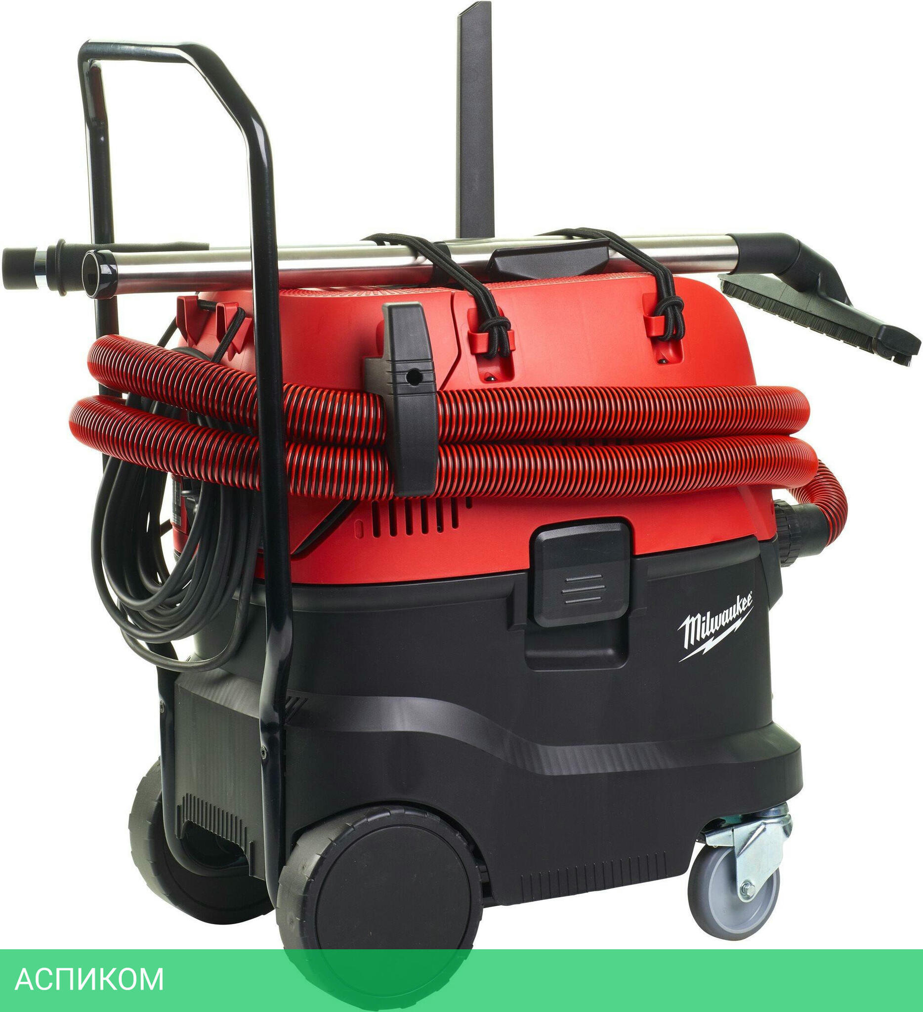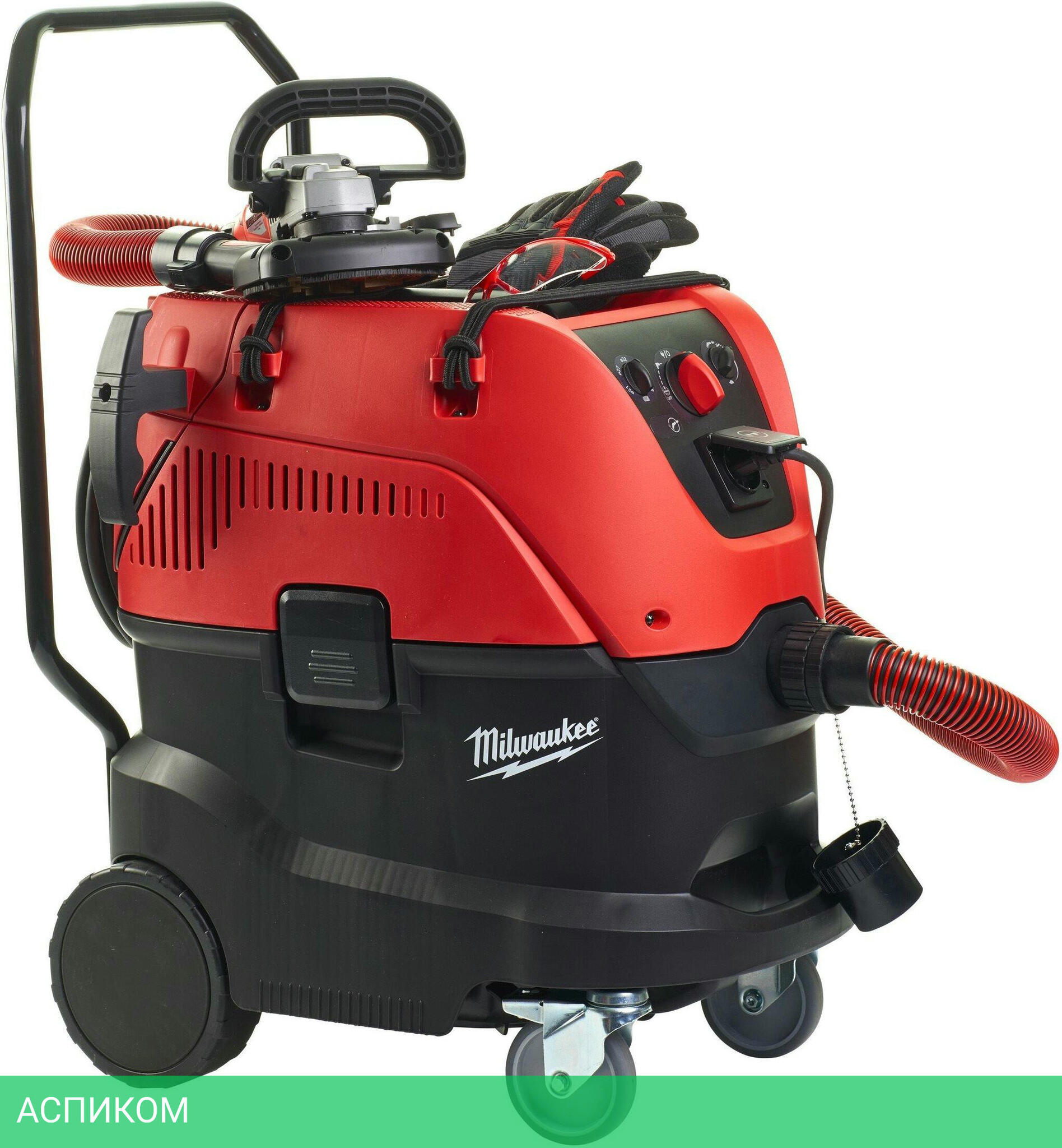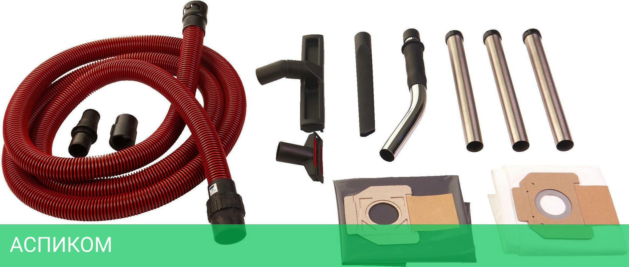 пылесос, 2 х адаптера для подключения к инструменту, трубка держатель, 2 х удлинительные трубки, щелевая и для пола насадки, флисовый фильтрующий мешок, мешок для пыли, шланг 4 м х 38 мм, рукоятка для транспортировки, инструкция, упаковка