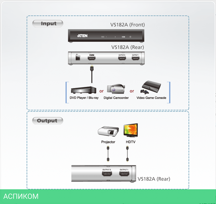 1x HDMI разветвитель VS182A 1x HDMI кабель 1x Адаптер питания 1x Руководство пользователя Подробнее: http://www.aten.ru/index.php?p=shop&action=showproduct&id=143&cid=48&pname=vs182a-a7-g-2-portovyi-hdmi-razvetvitel-videosignala-video-splitter