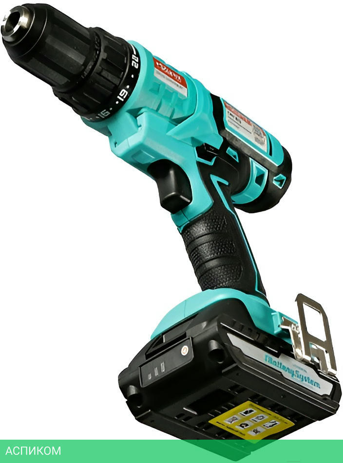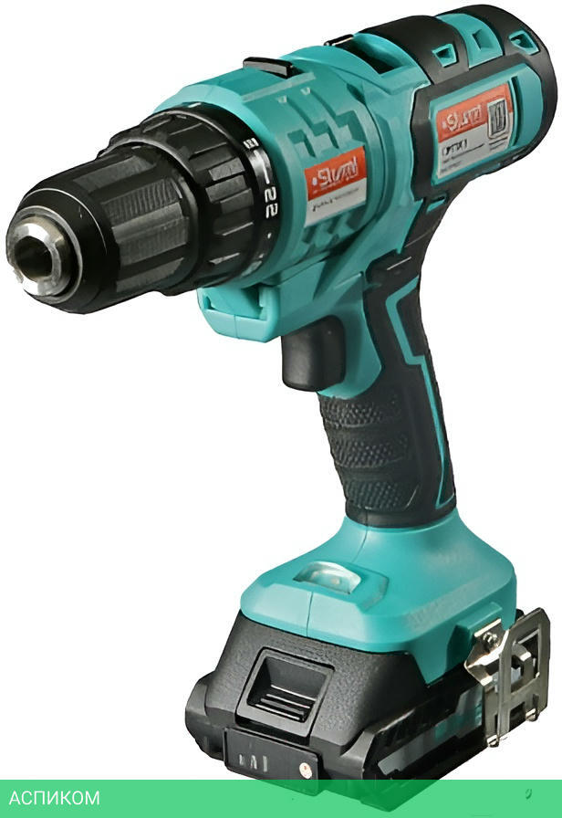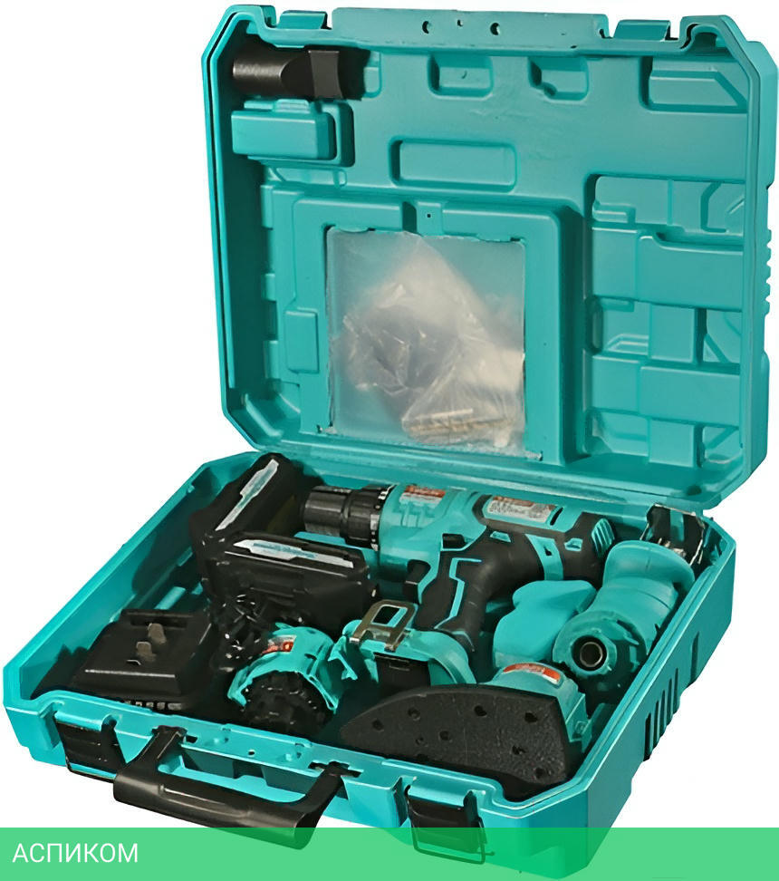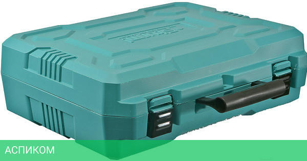 кейс, зарядное устройство, угловая насадка, держатель бит, сверлильный патрон, два аккумулятора