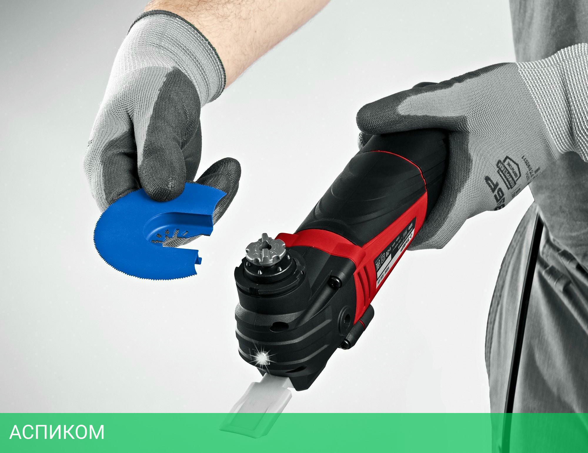 Реноватор, шабер, универсальная прямая пильная насадка, шлифовальная подошва, наждачная бумага - 3 шт., сегментное пильное полотно 88 мм., патрубок подключения к пылесосу, кейс, руководство по эксплуатации.