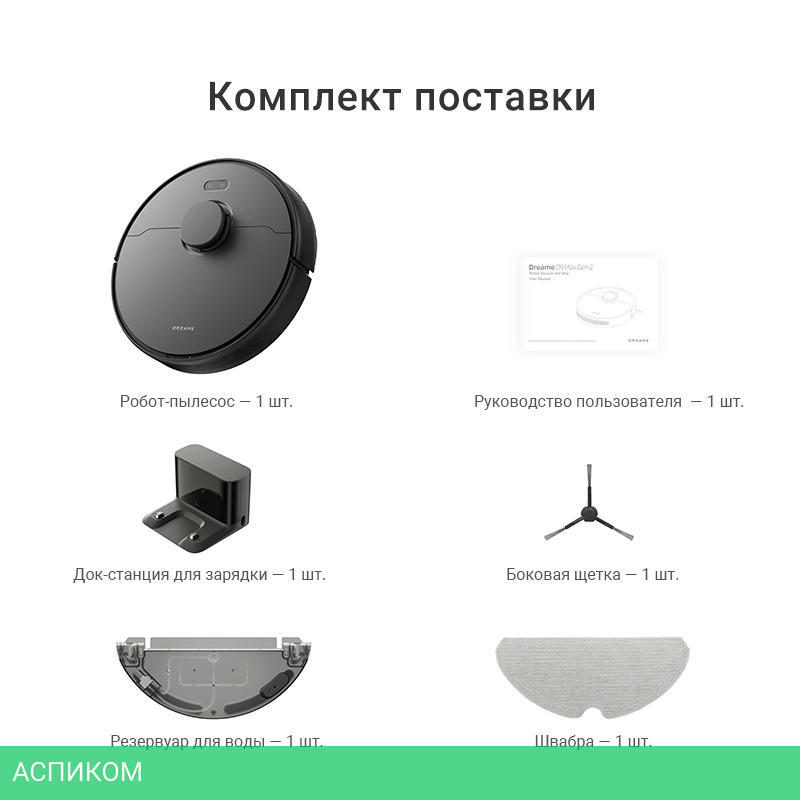 робот-пылесос 1 шт; зарядная док-станция 1 шт; бак для воды 1 шт; руководство пользователя 1 шт; боковая щетка 1 шт; насадка для швабры 1 шт; упаковка