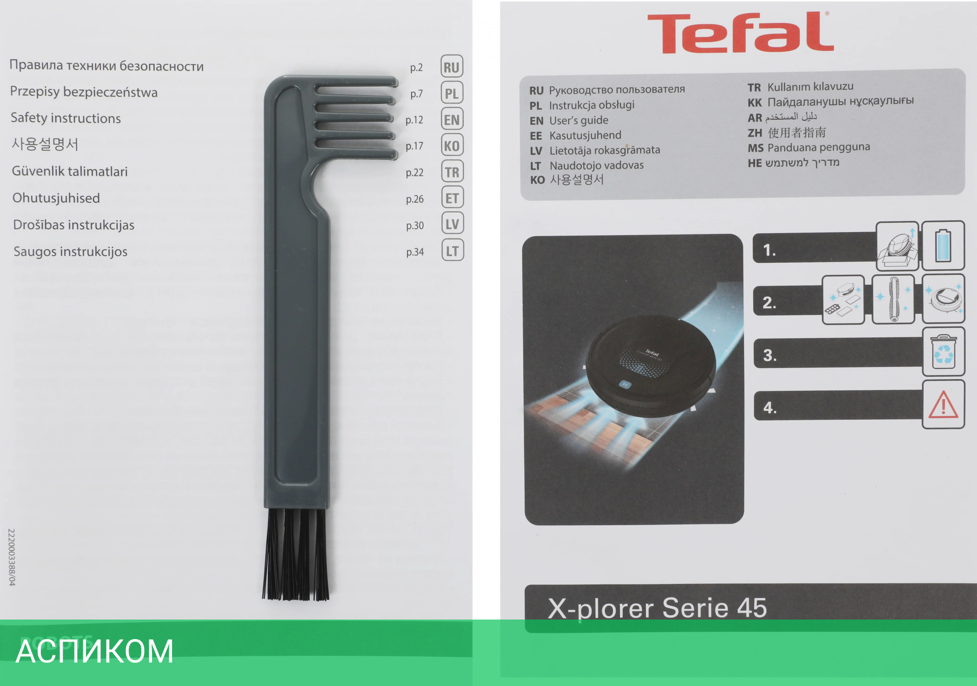 зарядная станция, документация, боковая щетка (2 шт.), фильтр, контейнер для сухой уборки, чистящие салфетки