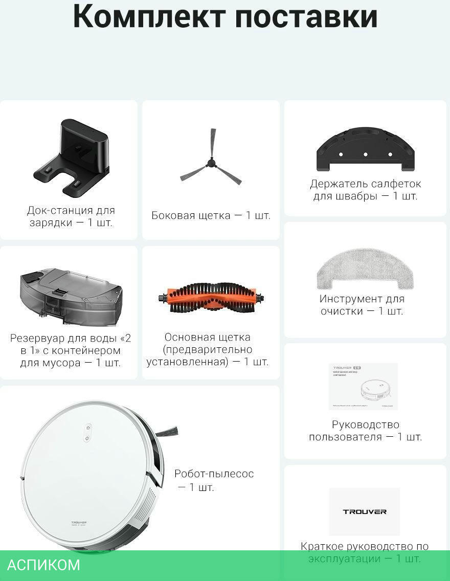 пылесос, док-станция, боковая щётка 1 шт, держатель для швабры 1 шт, резервуар для воды с контейнером для мусора (2в1), основная щётка, салфетка, руководство пользователя, руководство по эксплуатации, упаковка