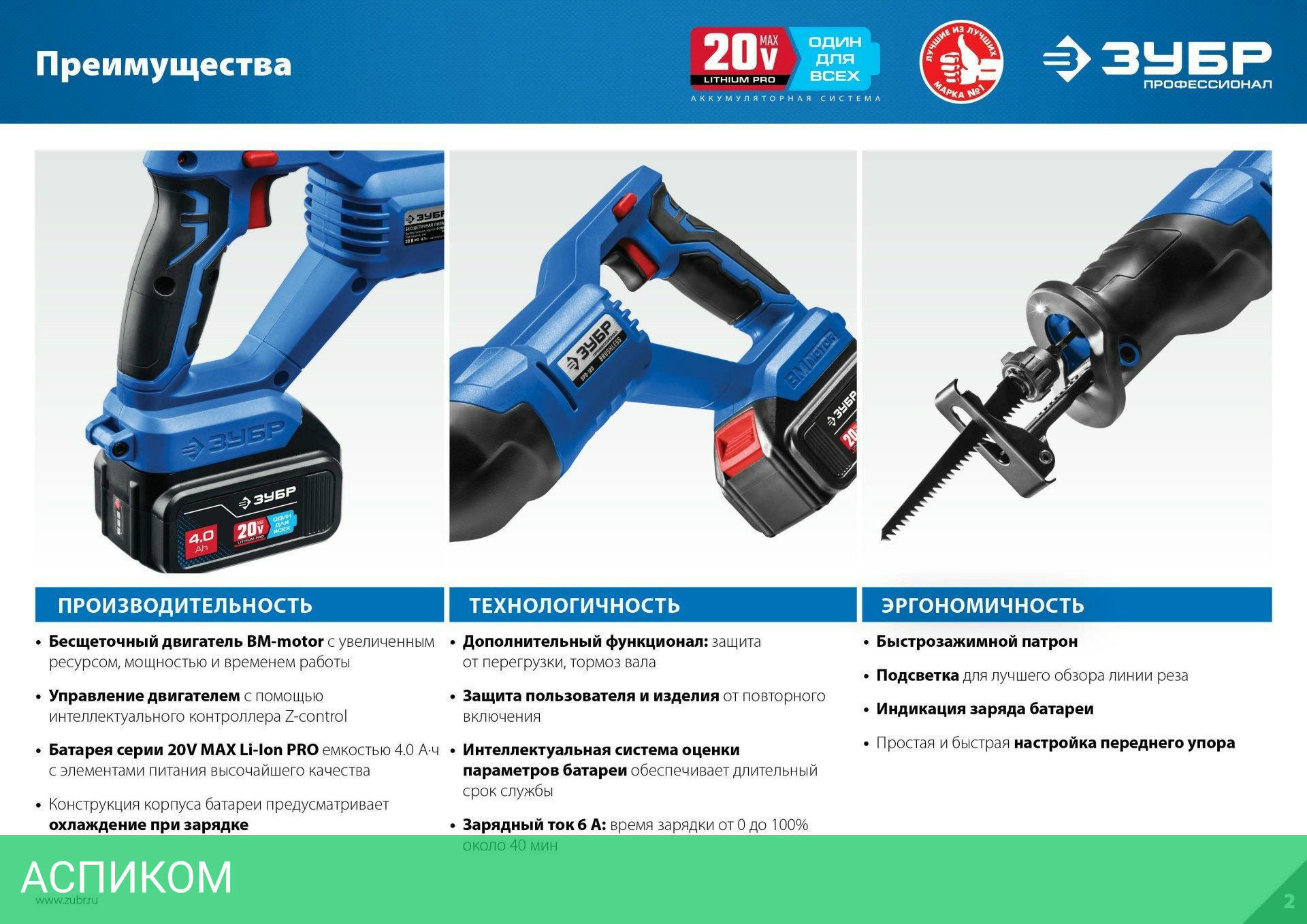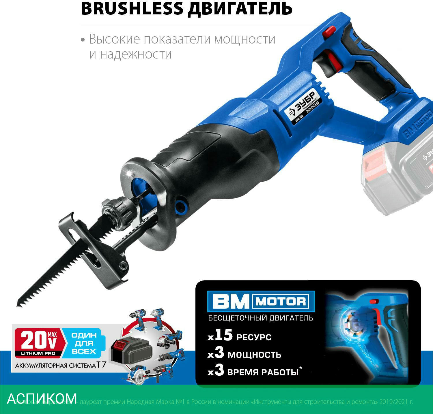 Бесщеточный двигатель Brushless. Бесключевой патрон. Металлический корпус редуктора. Возможность фигурного пиления материала. Переставной упор для изменения глубины пиления. Резиновые накладки на корпусе.