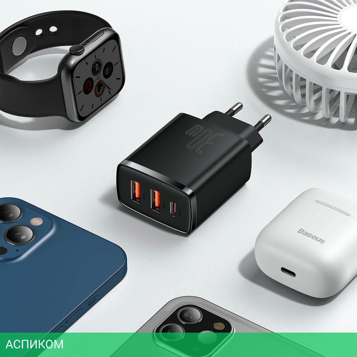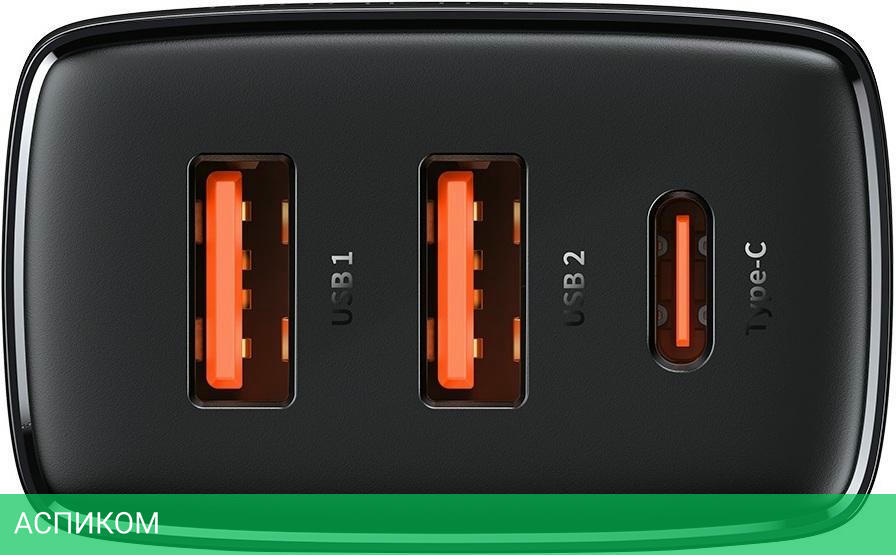 сетевое зарядное / для планшетов; для телефонов / 3 / отсутствует (нужен кабель) / USB Type-A; USB Type-C / 30.0 / да / черный