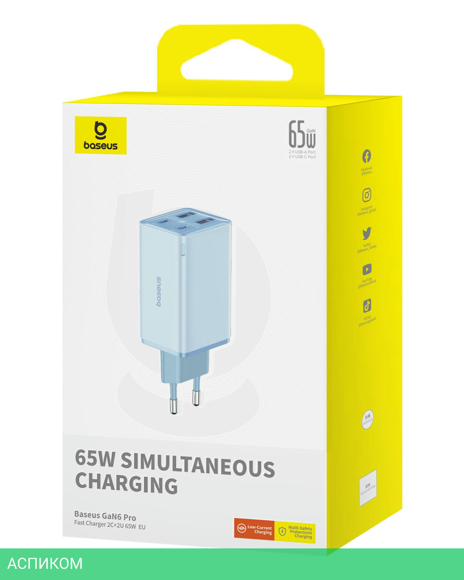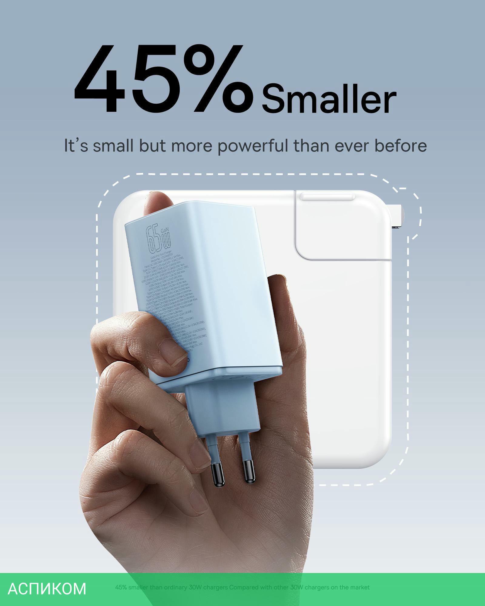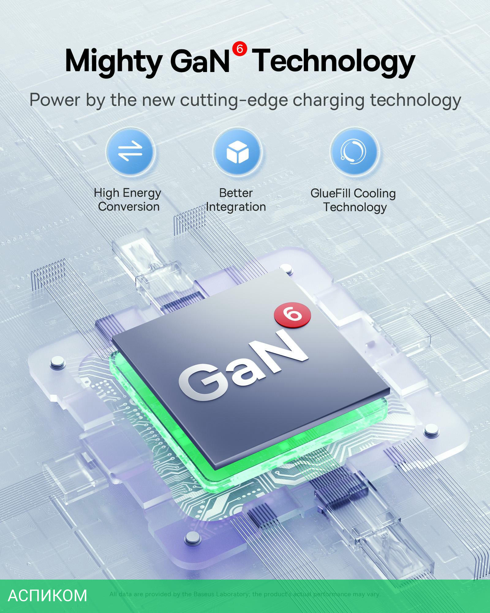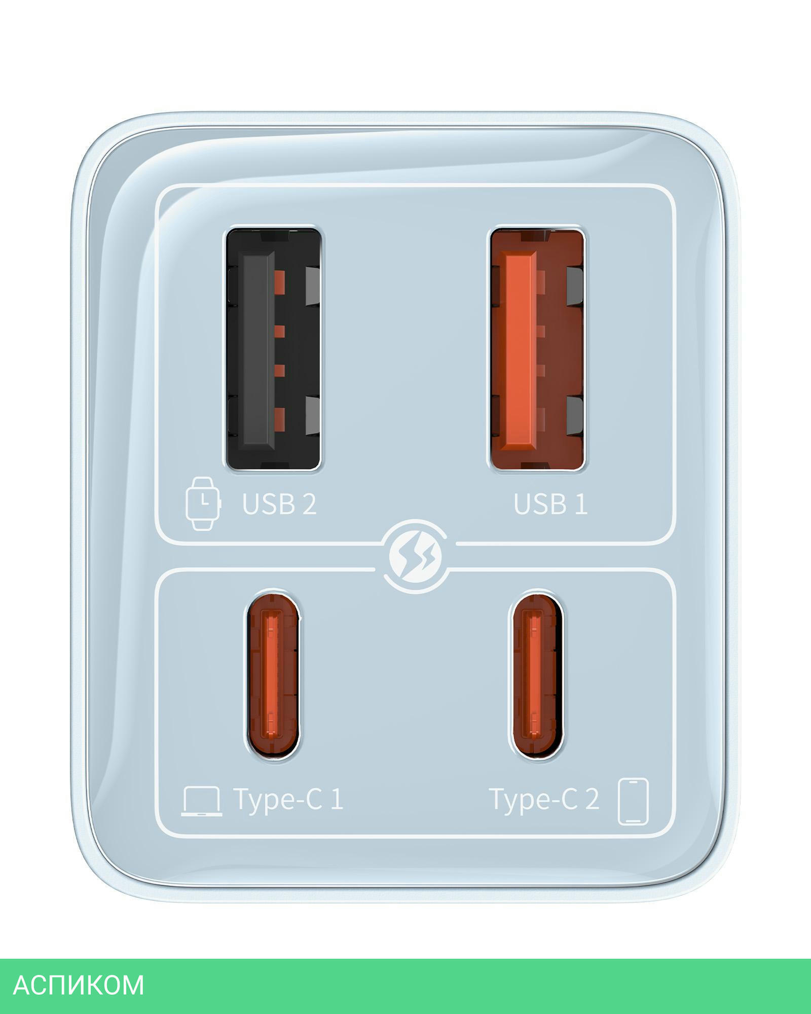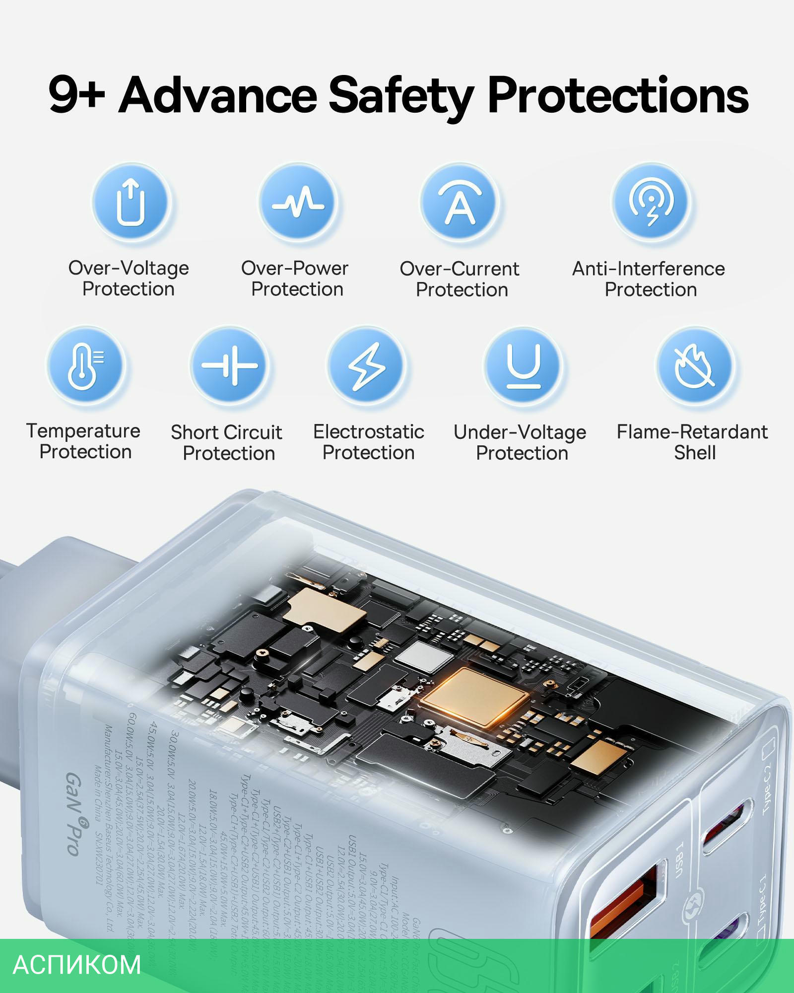 мощность до 65 Вт, что даёт возможность заряжать до 4х устройств одновременно; технология GaN6 (удвоенная скорость зарядки); сразу четыре порта для зарядки: USB-C x2 и USB-A x2; защита от перегрева и технология Global Glue Fill