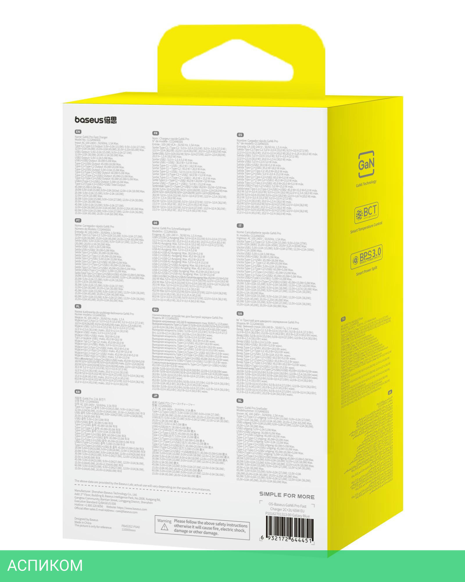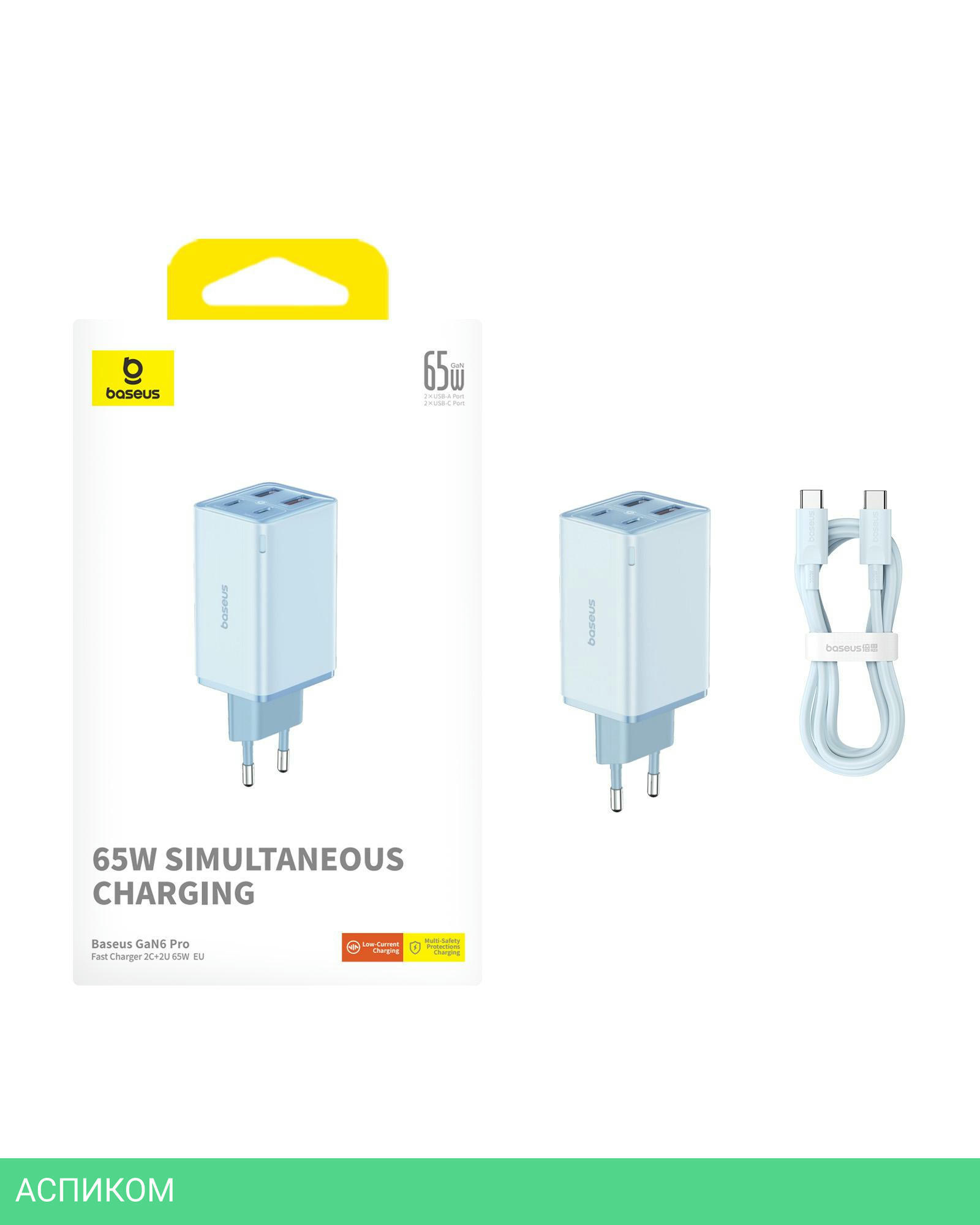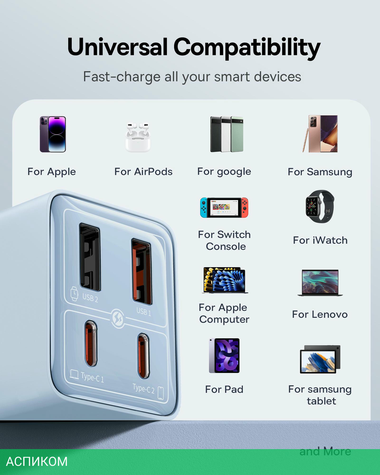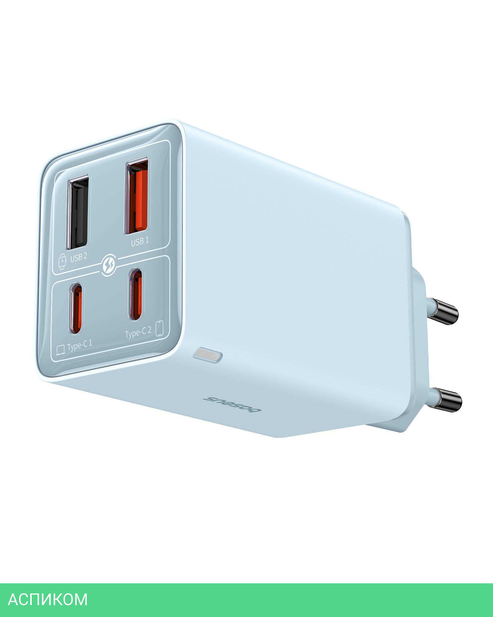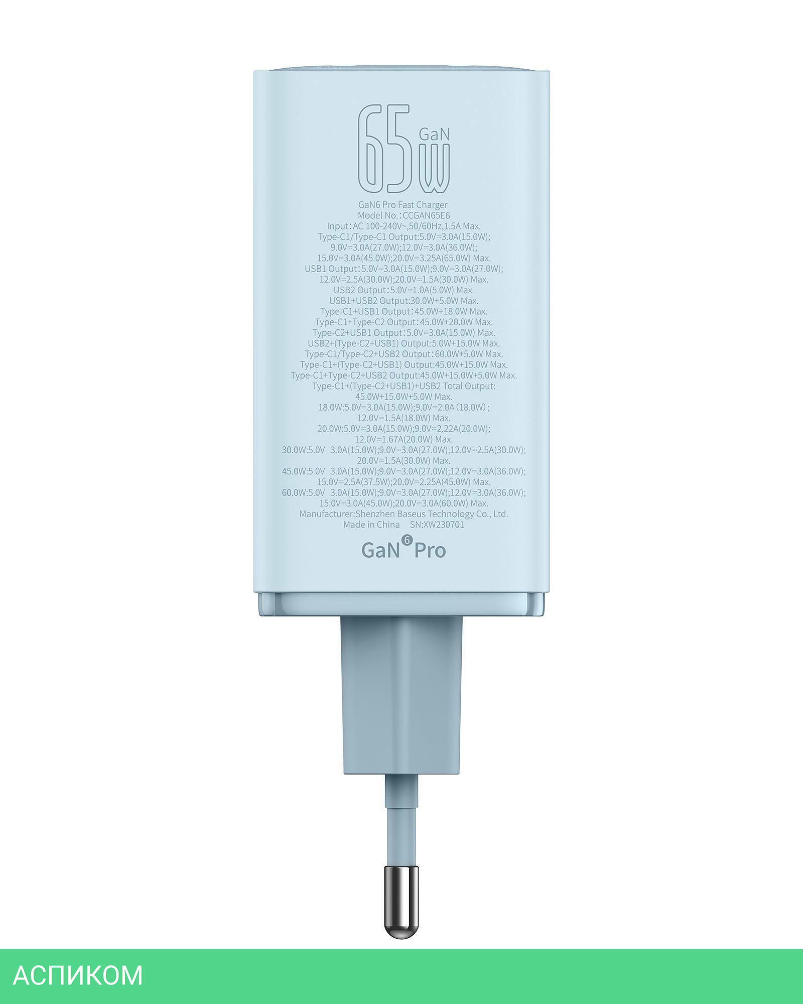 мощность до 65 Вт, что даёт возможность заряжать до 4х устройств одновременно; технология GaN6 (удвоенная скорость зарядки); сразу четыре порта для зарядки: USB-C x2 и USB-A x2; защита от перегрева и технология Global Glue Fill