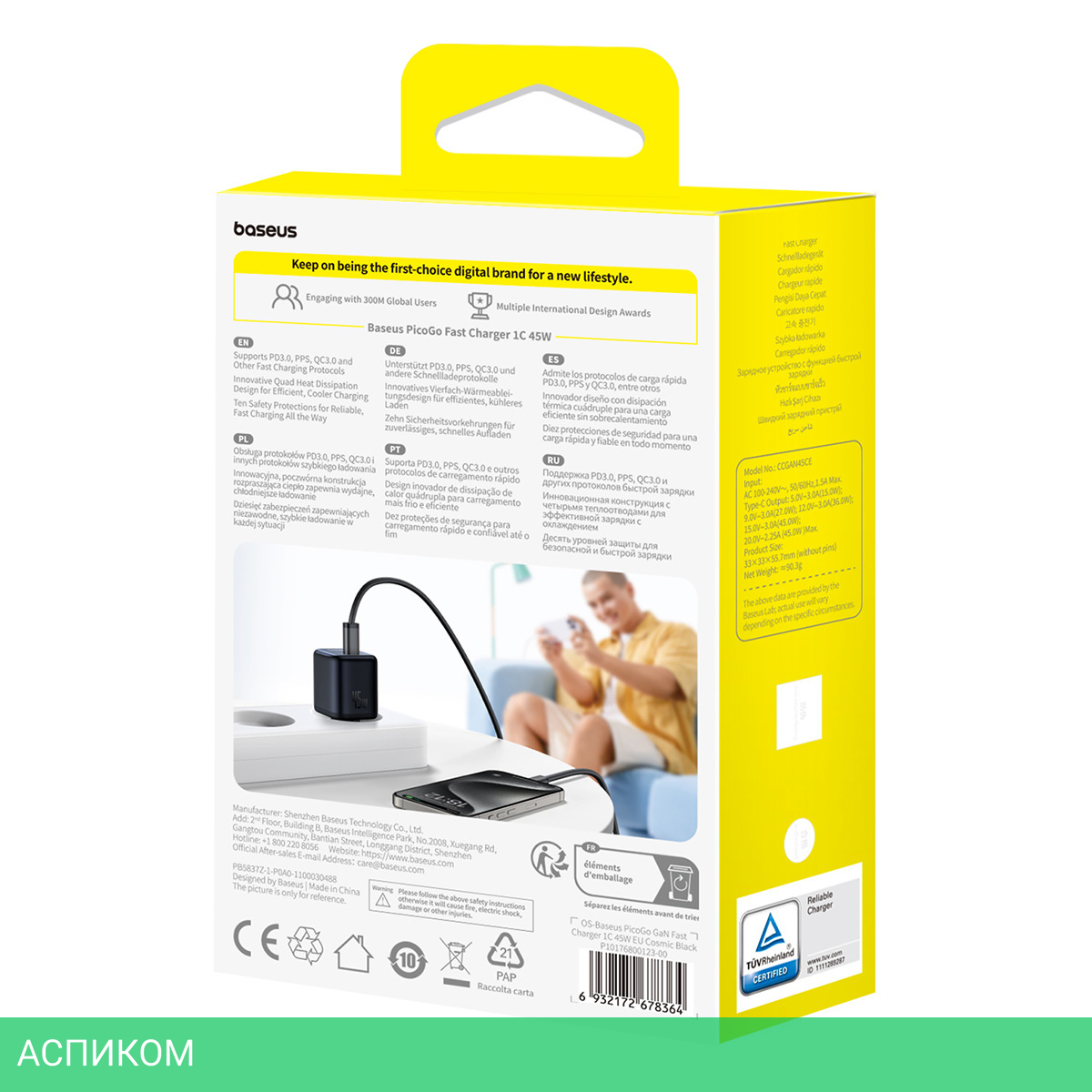 сетевое зарядное / черный / для планшетов; для телефонов / 1 / USB Type-C / 45.0 / да