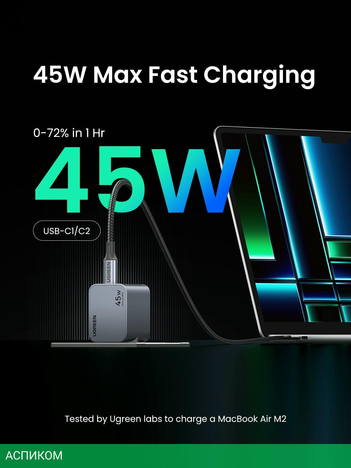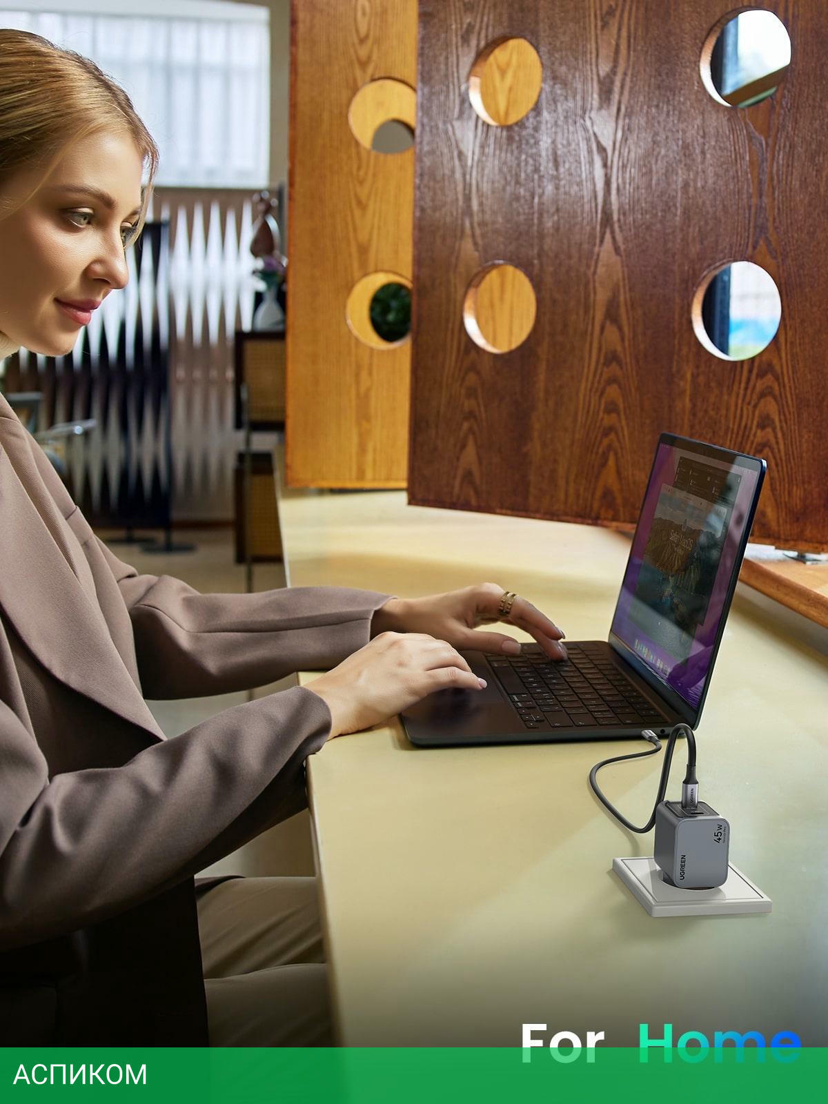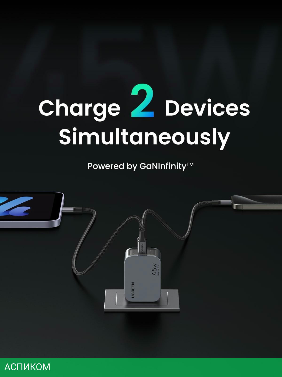 сетевое зарядное / для наушников; для ноутбуков; для планшетов; для телефонов / 2 / отсутствует (нужен кабель) / серый / USB Type-C / 45.0 / да