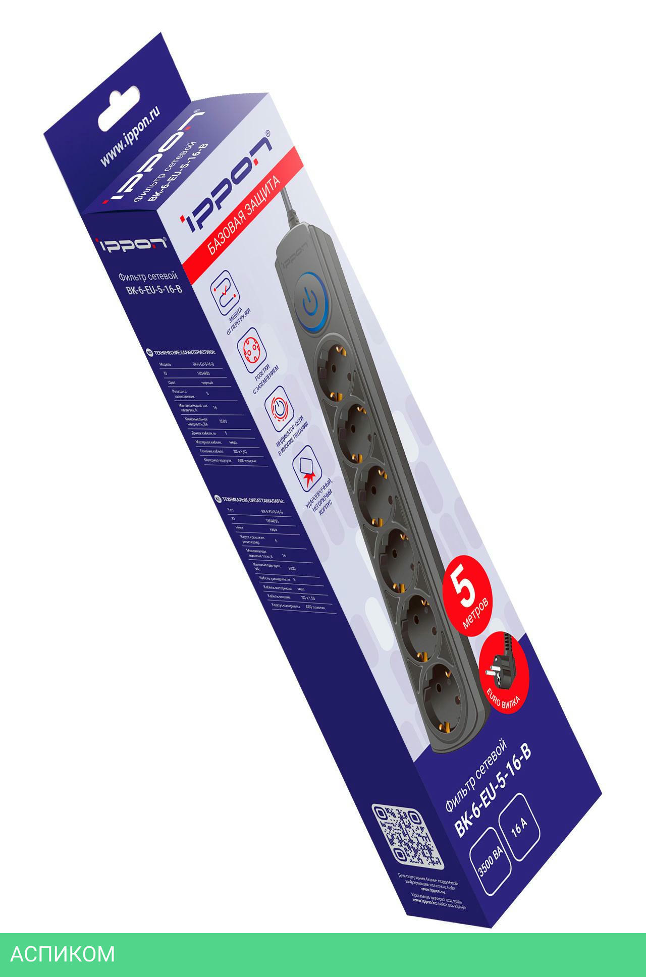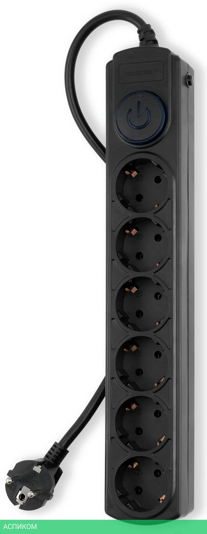 6 евророзеток с заземлением. Входная вилка Schuko. Защита от перегрузки. Защита от импульсов высокого напряжения. Защита от перетирания провода в месте входа в корпус фильтра. Ударопрочный негорючий корпус. Кнопка питания с индикатором сети.